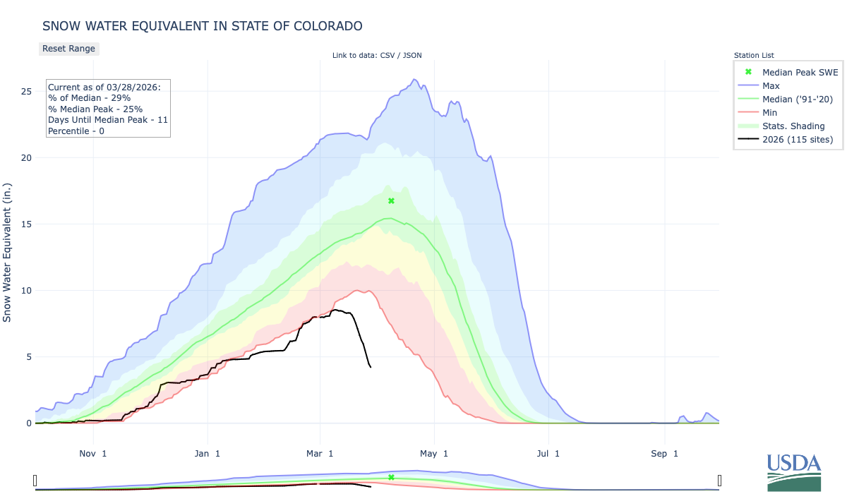 Looking at the statewide water-year-to-date snowpack in the SNOTEL network, it’s clear that snow water equivalent has taken a massive nosedive over the past week or so. On average, Colorado’s peak snowpack date is April 7, meaning that we should still be seeing snowpack accumulate in late March. Instead, averaged over the state, snow water equivalent has declined by over 2.5 inches in the last week. We typically don’t see snowpack melt this quickly until May, so to observe this trend so early in the season is highly concerning.