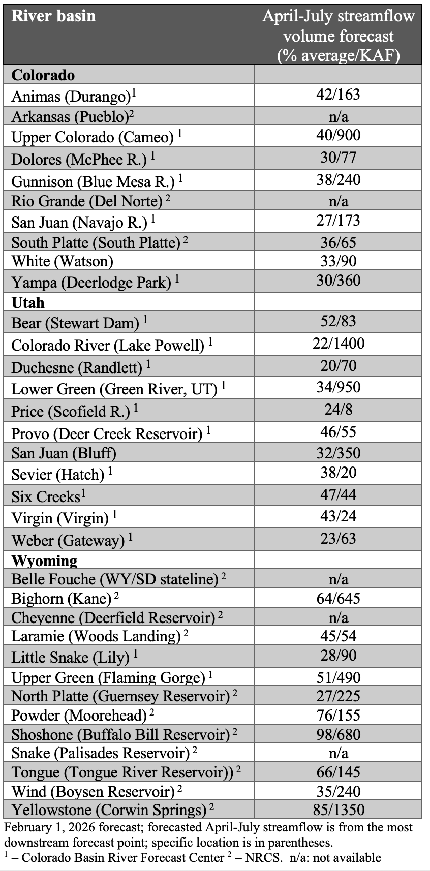 After low and early peak snowpack, annual streamflow volume forecasts were much below average on April 1. Annual streamflow volume forecasts ranged from 25-45% of average in Colorado, 20-55% of average in Utah and 25-100% of average in Wyoming. The inflow to Lake Powell is forecasted at 22% of average (1.4 million acre-feet). Regional streamflow forecasts were highest in the Snake and Missouri River basins of northern Wyoming where streamflow volume forecasts ranged from 65-100% of average.