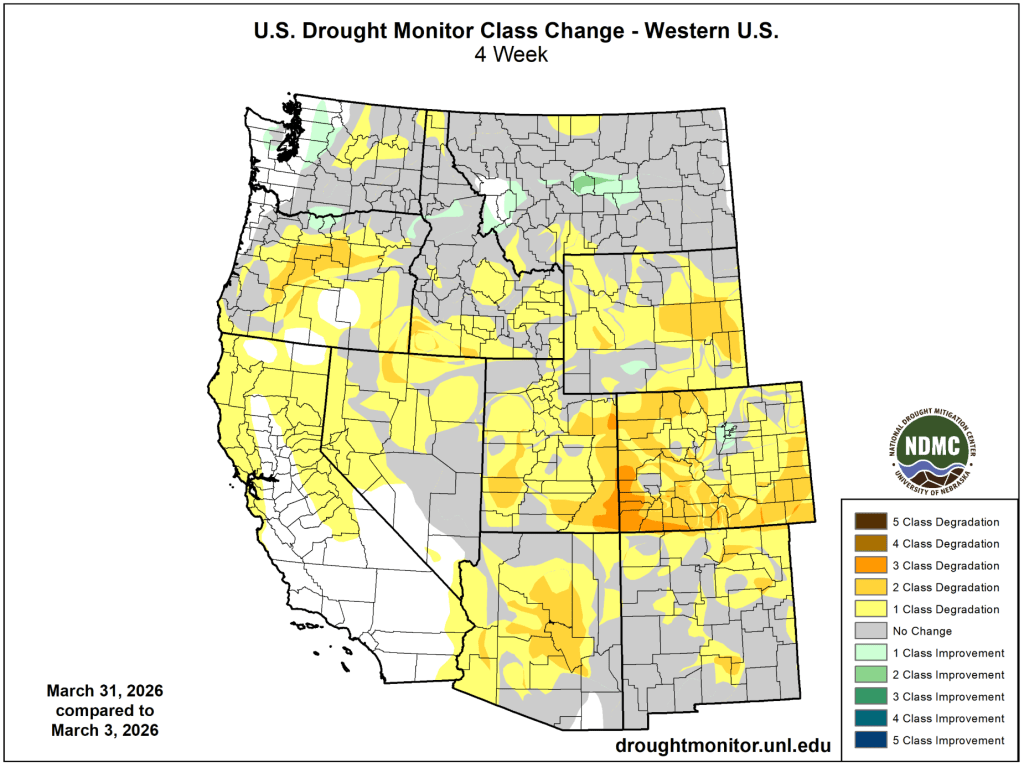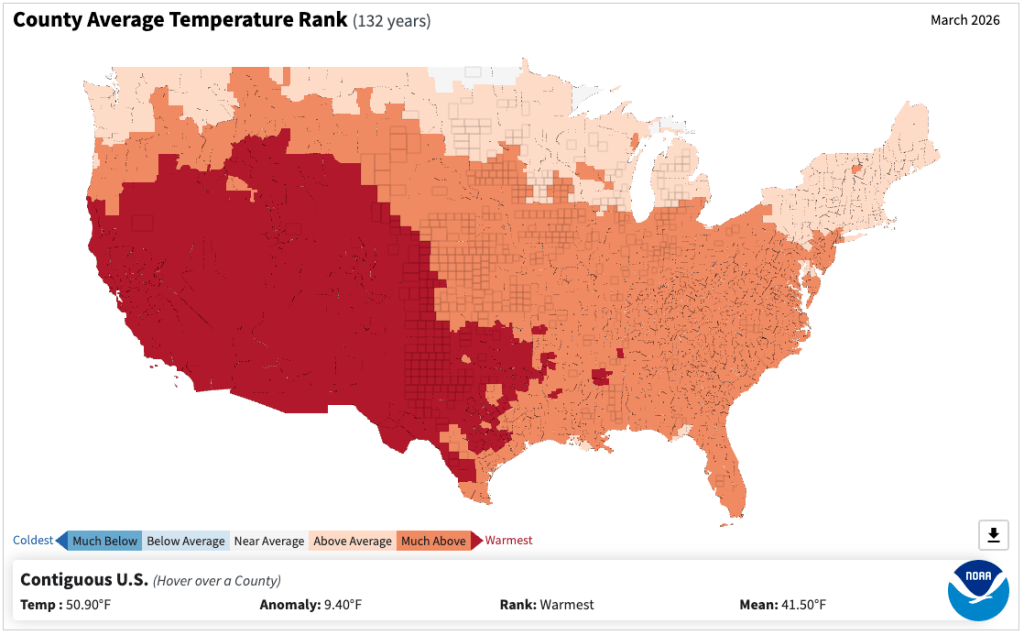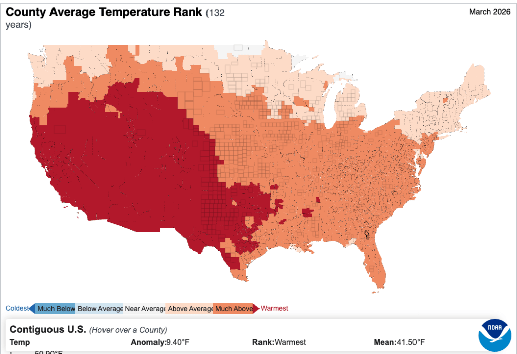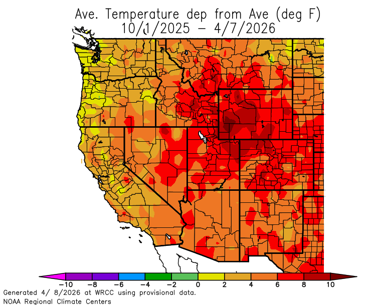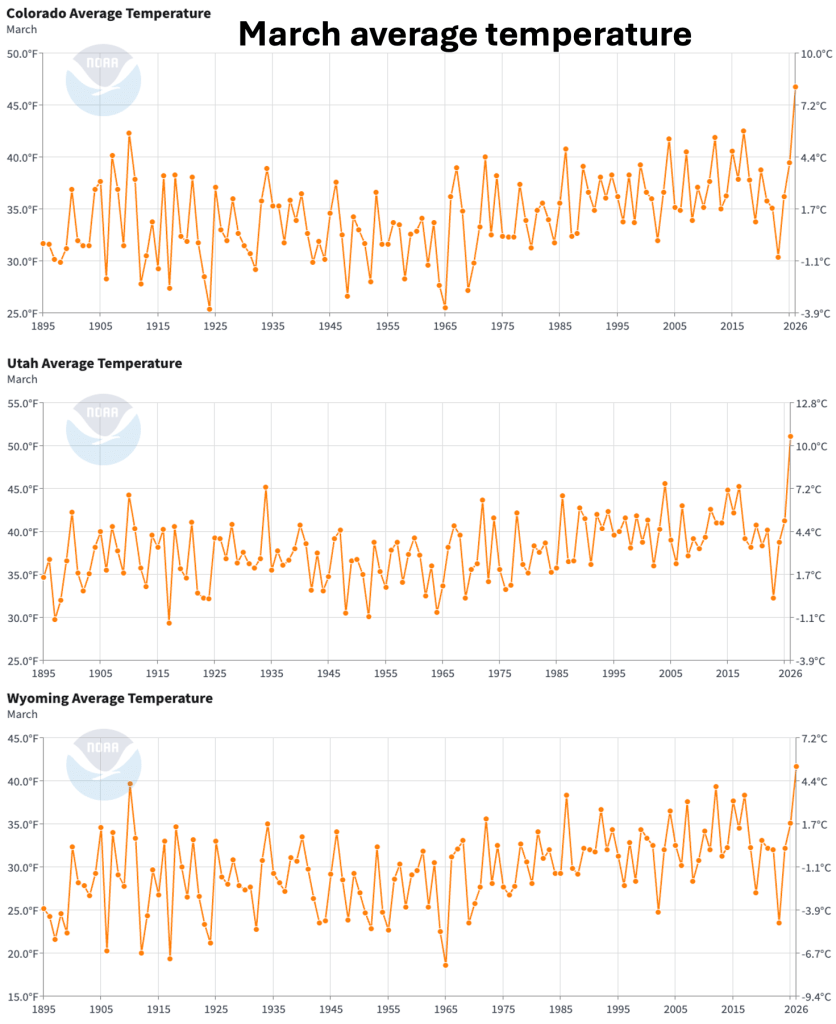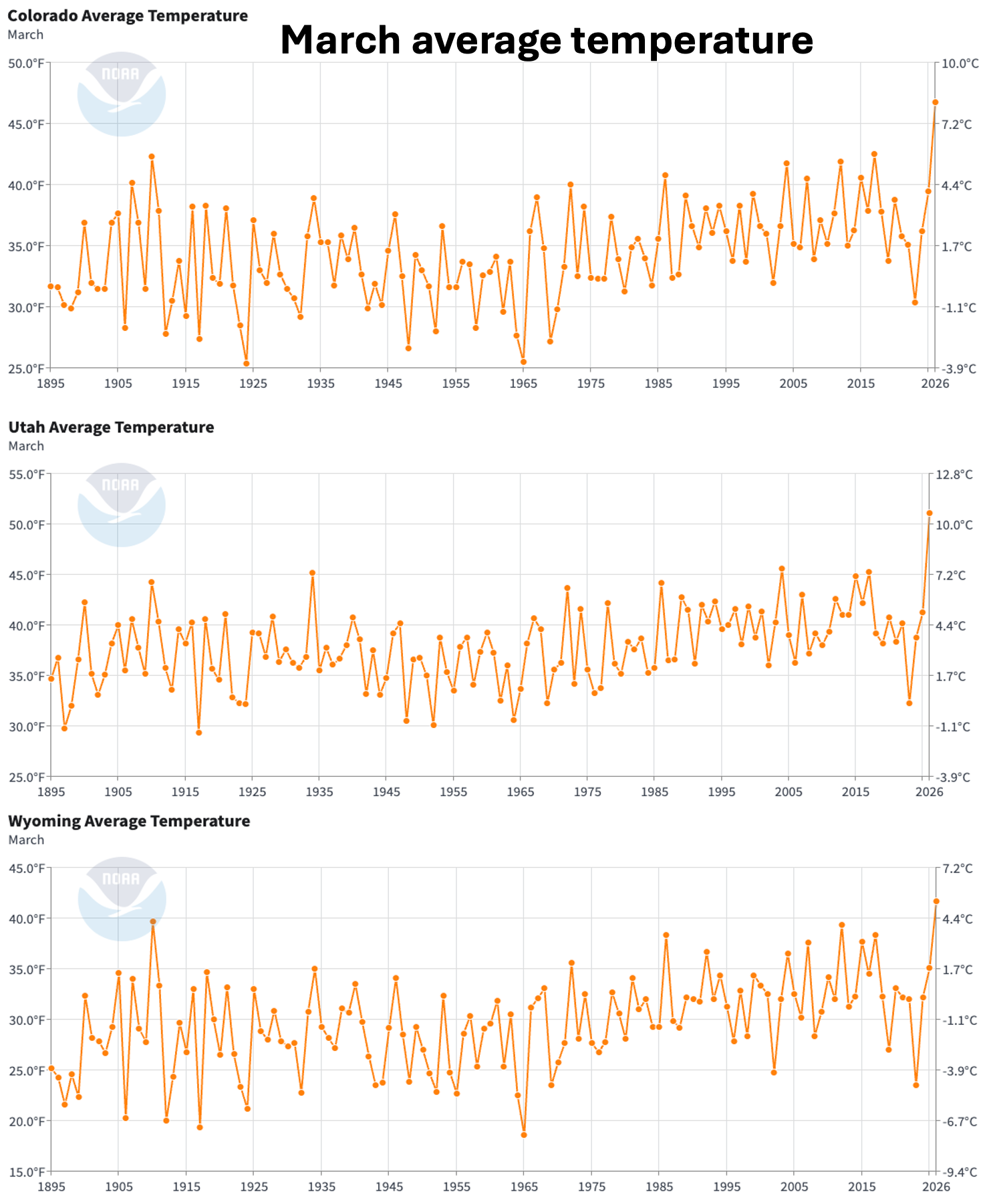 Significant weather event: March heat wave. The heat wave during March 2026 was unprecedented in the western U.S. climate records since 1895. March 2026 average temperatures shattered records in Colorado (by 4.3ºF), Utah (by 5.5ºF), and Wyoming (by 2ºF). Amongst weather monitoring sites with at least 50 years of data, new March temperature records were set at 85% of sites in Colorado, 82% of sites in Utah and 60% of sites in Wyoming. In Utah, previous March temperature records were exceeded by 9.7ºF in Alta and 8.9ºF in Escalante. New all-time maximum March temperature records were set at 80-90% of weather sites in Colorado and Utah, and at 70% of sites in Wyoming. At many locations in Colorado and Utah, new March temperature records exceeded April maximum temperature records. Maximum March 2026 temperatures along the Front Range of Colorado reached the 90s with Burlington, CO recording 99ºF on March 26. Extremely high March temperatures were present across the majority of the West, and record statewide March temperatures were set in Arizona, California, Colorado, Idaho, Oklahoma, Nevada, New Mexico, Texas, Utah and Wyoming. A new record March temperature was also set for the contiguous U.S.