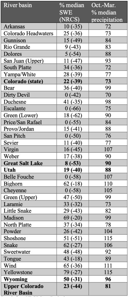 March weather conditions promoted rapid intensification of snow drought. Snowpack peaked three to nine weeks early and sits at record low levels at most locations in Colorado, Utah and much of Wyoming. Record low snowpack was driven by low March precipitation and record hot March temperatures. Consequently, drought conditions expanded to cover 93% of the region, and annual streamflow volume forecasts are much below normal with 22% of normal inflow forecasted for Lake Powell.