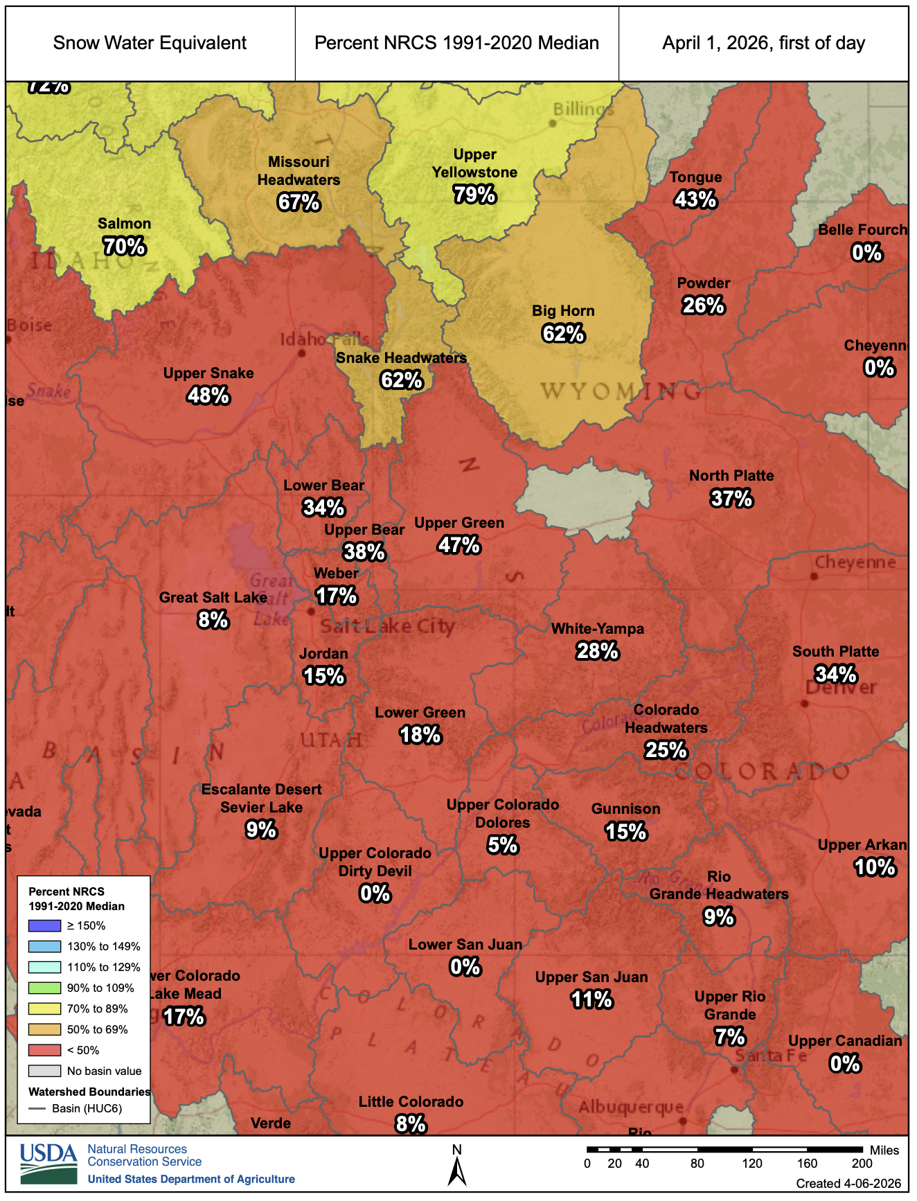 April 1 SWE conditions were record-low for all regional river basins, except those in northwestern Wyoming. On a statewide basis, record-low snowpack was observed in Colorado (24% median), Utah (22% median), and Wyoming (47% median). Snowpack in many southern Colorado and southern Utah watersheds has melted up to 65 days early, including the Upper Arkansas, Upper Dolores, and Upper Gunnison River basins in Colorado and the Dirty Devil, Escalante, Price, and San Pitch River basins in Utah. Record heat and low precipitation in March caused regional snowpack to peak nearly one month early. Typically, on April 1, only three of 213 Snotel sites in Colorado and two of 179 sites in Utah are melted out completely. On April 1, 2026, 36% of Snotel sites in Colorado, 60% of sites in Utah, and 28% of 196 sites in Wyoming were melted out. The snowpack in the Upper Colorado River basin peaked at a record low percent of median peak SWE and was 27% of median on April 1.