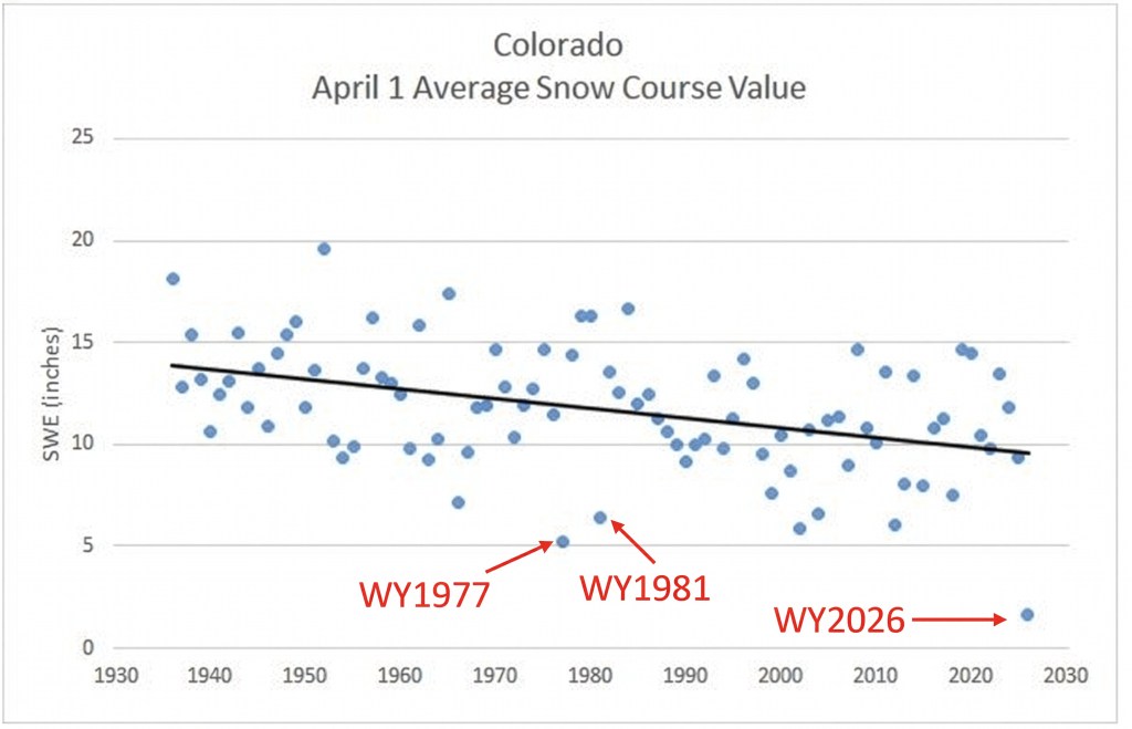 The result is clear: Even though precipitation accumulation wasn’t terribly far below normal, the snowpack was. The April 1 snowpack across Colorado was at a record low level, according to this year’s snow course, which is done by manual measurement and so goes back much farther than SNOTEL measurements.