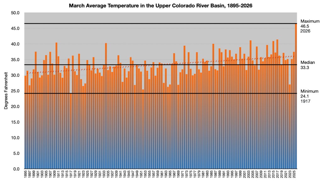 This won’t come as a surprise to many people, but it’s now official: March 2026 was the hottest March on record by a lot in the Southwest and beyond. The Upper Colorado River Basin’s average temperature for the month was 46.5° F, or more than 13° higher than the 1895-2026 median. The graph below makes it very clear that the place has been getting hotter over the past fifty years, with the only real break coming in March 2023, when snow was piling up in the mountains.