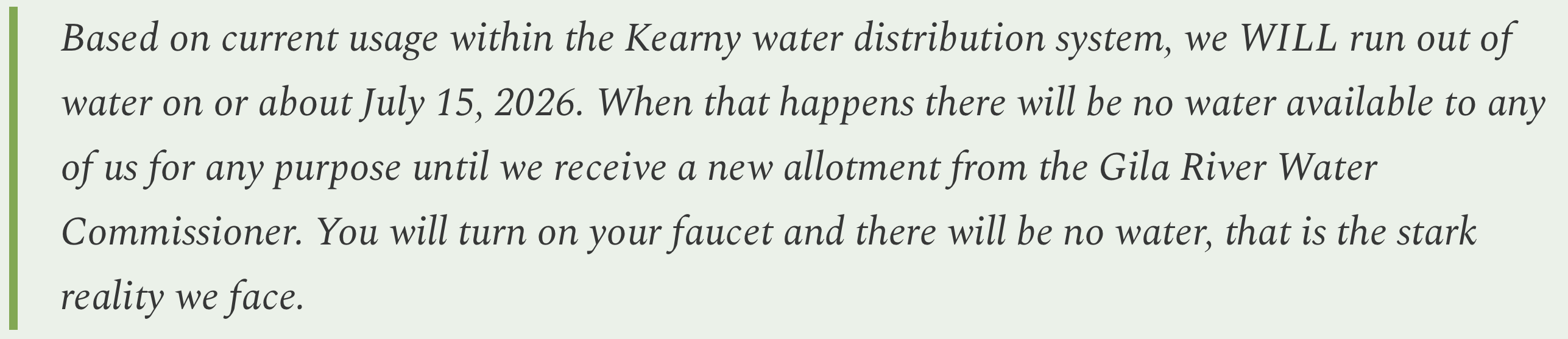 Kearney has a maximum allotment of 610 acre-feet of water from the Gila River. This year, however, extreme drought conditions have brought the allotment down to just .76 acre-feet, forcing the town to impose severe restrictions on use to try to make it last until the monsoon arrives.