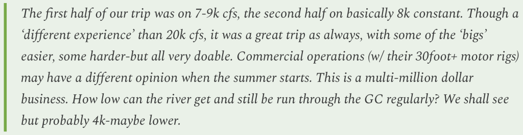 So, given all of that, we can assume that the flows shouldn’t drop much below current levels this summer. Of course, if conditions are worse than expected, then the reservoir could drop to 3,500 feet earlier than anticipated, which could force dam operators to further curtail releases to “defend” minimum power pool. If so, then you might see nighttime releases drop as low as 5,000 cfs. If that’s not enough, then I suppose dam operators would have to go to a run-of-the-river scenario, where flows could plummet to 2,000 or 3,000 cfs, which would make rafting quite interesting.