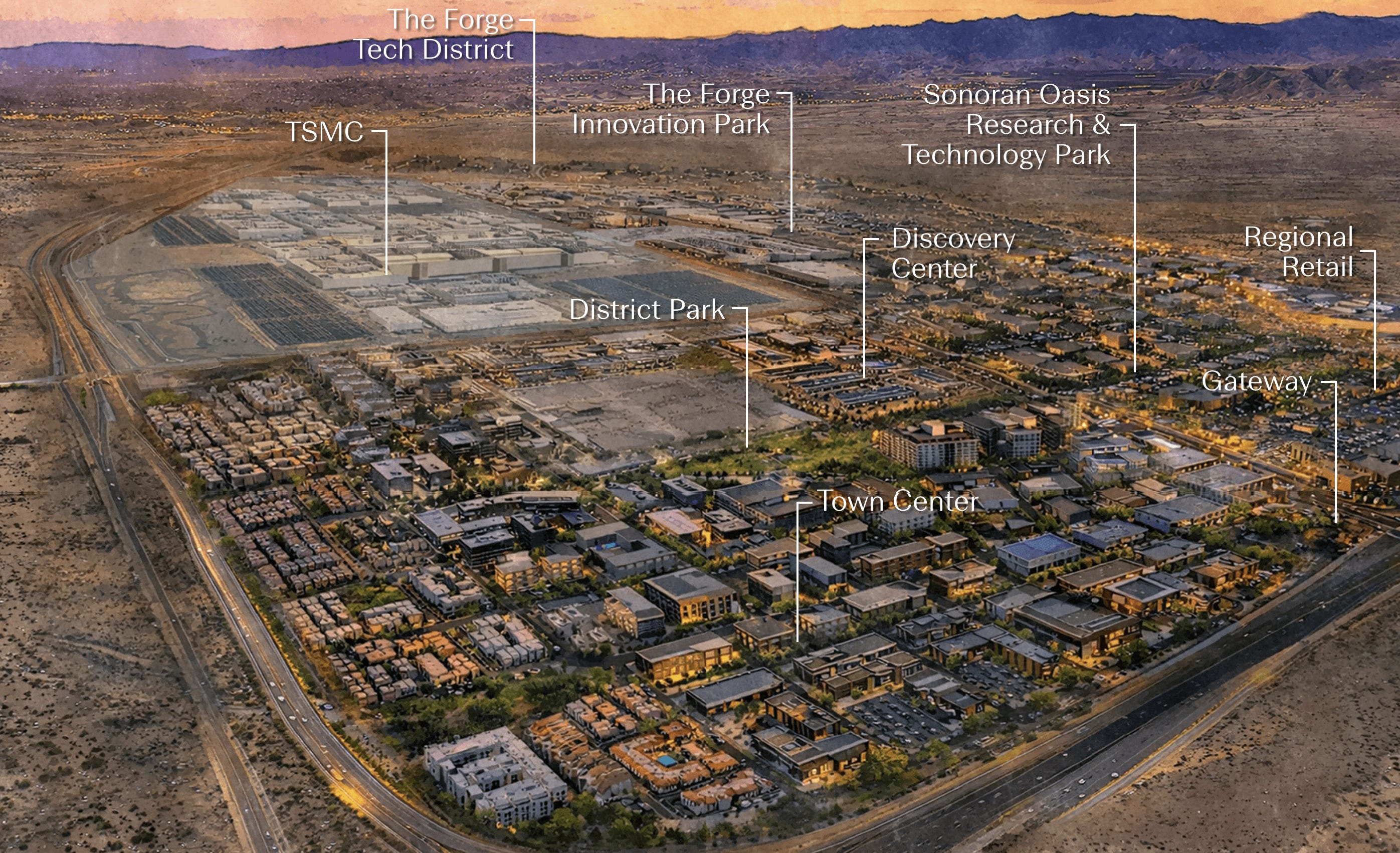 Halo Vista’s developers are billing it as a companion development to TSMC’s $165 billion semiconductor fabrication facility complex. It will wrap around the industrial campus (thus the “halo” in the name), and plans call for some 30 million square feet of industrial, retail, office, research, and healthcare spaces along with 9,000 or more residential units.