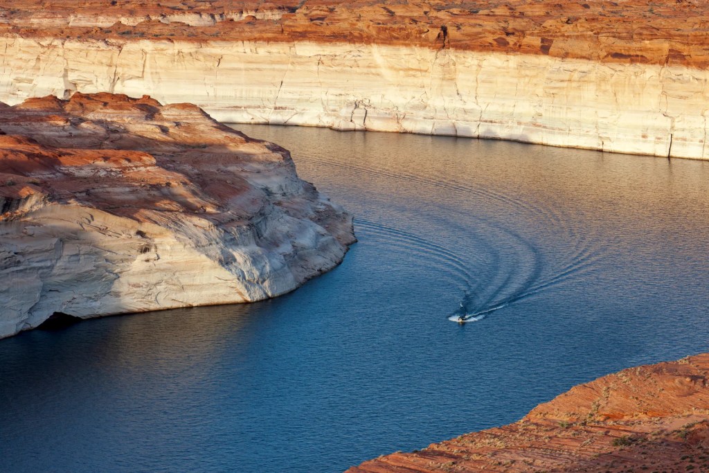 Lake Powell is formed by Glen Canyon Dam, a striking 710-ft tall concrete arch braced against ruddy sandstone walls. It plugs the Colorado just after the river enters Arizona. Meant to ensure water deliveries to the lower basin states of Arizona, California, and Nevada, Glen Canyon Dam was finished in 1963 to complement the Colorado River’s audacious engineering that distributes water through mountains and uphill to the largest cities in the Southwest and to the region’s most productive farmland. When full, Lake Powell holds enough water to flood the entire state of Virginia to the depth of one foot.