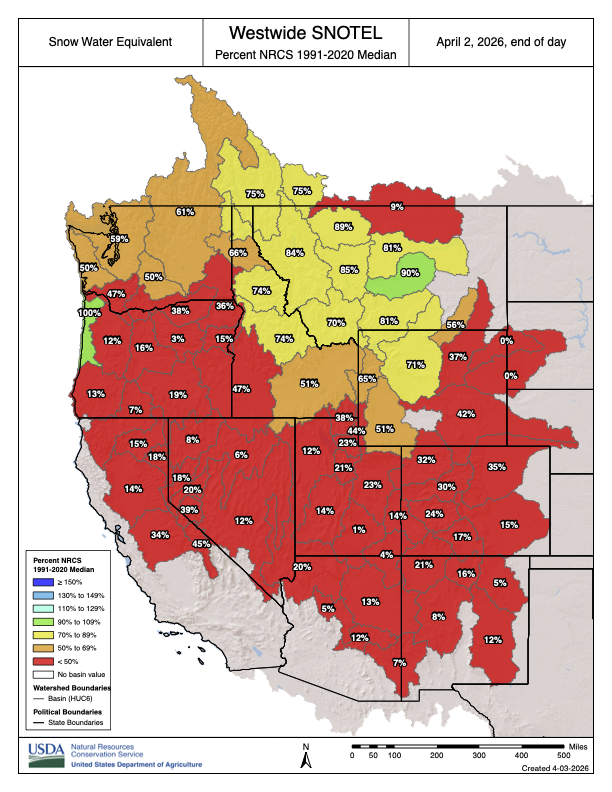 Map showing the percent of the previous record-low April 1 SWE that was observed on April 1, 2026. Locations where the previous record low was zero not shown. Data obtained from USDA/NRCS.