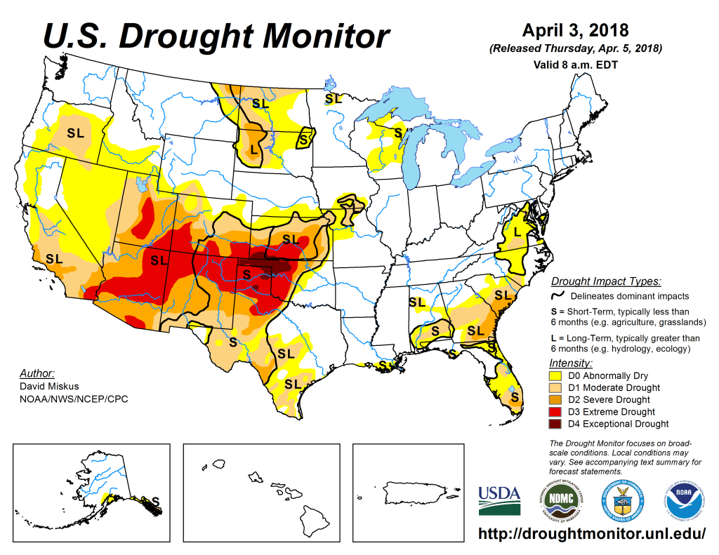 On this weekโs map, rainfall (1 to 4 inches) during the past week led to targeted improvements in far eastern portions of Kansas and Nebraska. Meanwhile, conditions deteriorated on the map in areas of central and western Kansas, and southwestern South Dakota. For the week, average temperatures were 4 to 10+ ยฐF below normal across much of the region with the greatest departures observed in the Dakotas. Looking at climatological rankings for the past 60-day period (March 7 to April 7), several locations ranked among their driest on record, including Dodge City, KS (driest on record; -1.51 inches); Goodland, KS (driest on record; -1.05); and Manhattan, KS (2nd driest; -1.81 inches). In terms of hydrologic conditions, the U.S. Geological Survey is reporting below to much below normal streamflows across southwestern South Dakota, southern Nebraska, and central/western Kansas…