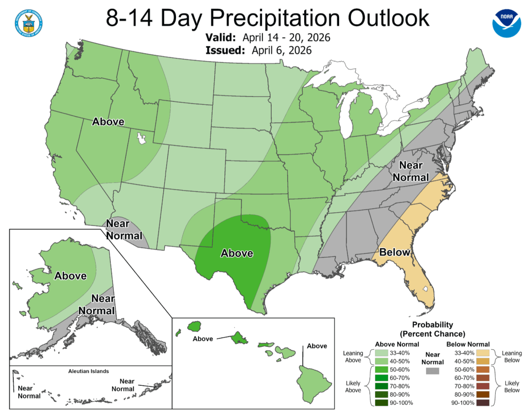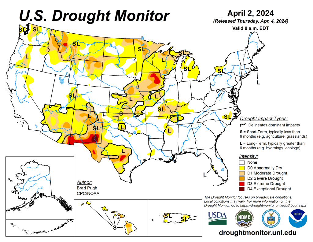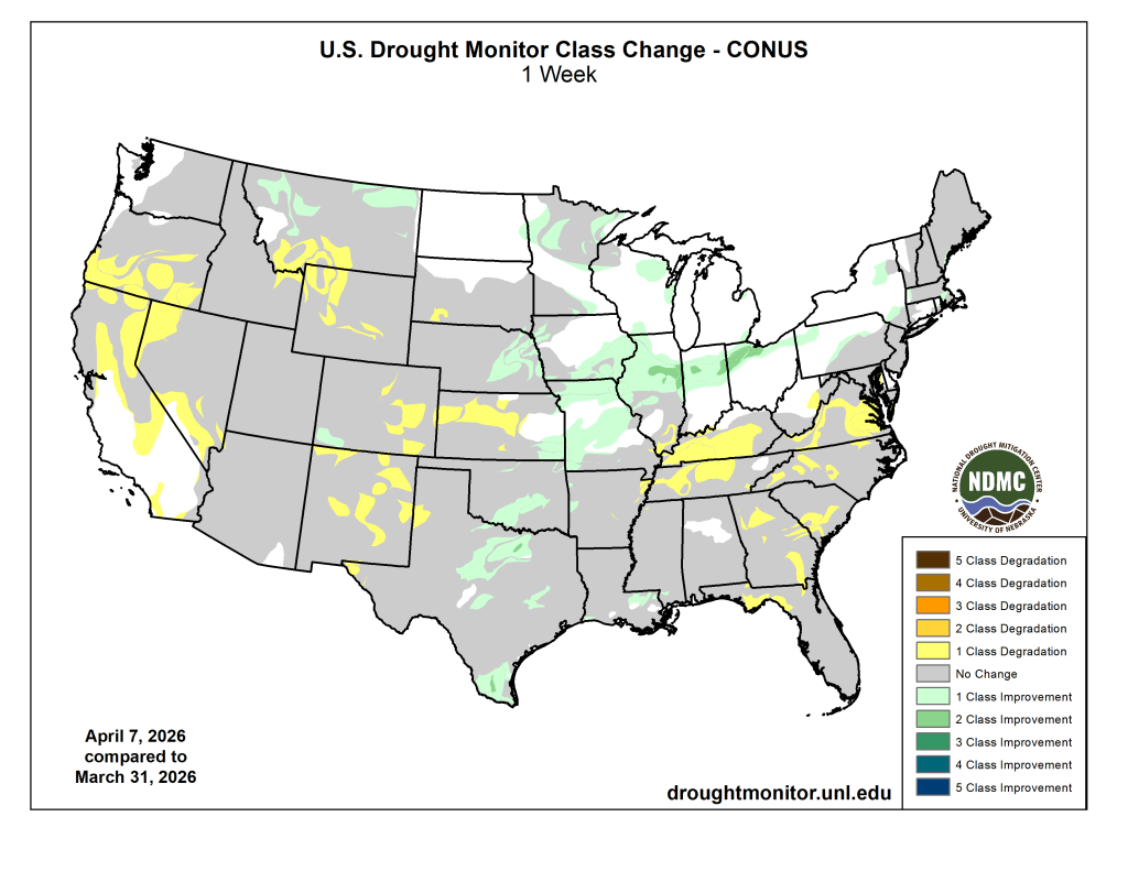 On this weekโs map, improvements were made in drought-affected areas of Texas, Oklahoma, Louisiana, and Arkansas, while areas of Tennessee saw degradations. In terms of precipitation during the past week, moderate to heavy rainfall accumulations (ranging from 3 to 6 inches) were observed in Texas, Oklahoma, and isolated areas of Louisiana. In Arkansas, some beneficial rains fell in the far-western portion of the state, which led to a boost in streamflow conditions. However, dry soils and significant precipitation deficits remain across the state with the NDMC CMOR tool showing many new impact reports during the past week. Looking at climatological rankings for the past 60-day period (February 7 to April 7), record to near-record dryness was observed in the region, including in Monticello, AR (4th driest; -5.7 inches), and Monroe, LA (7th driest; -6.69 inches). In Texas, Water for Texas (April 7) reports statewide reservoirs at 74% full, with eastern reservoirs in good condition while many western and southern reservoirs remain below normal. Average temperatures for the week were above normal across the region (2 to 12+ ยฐF)…