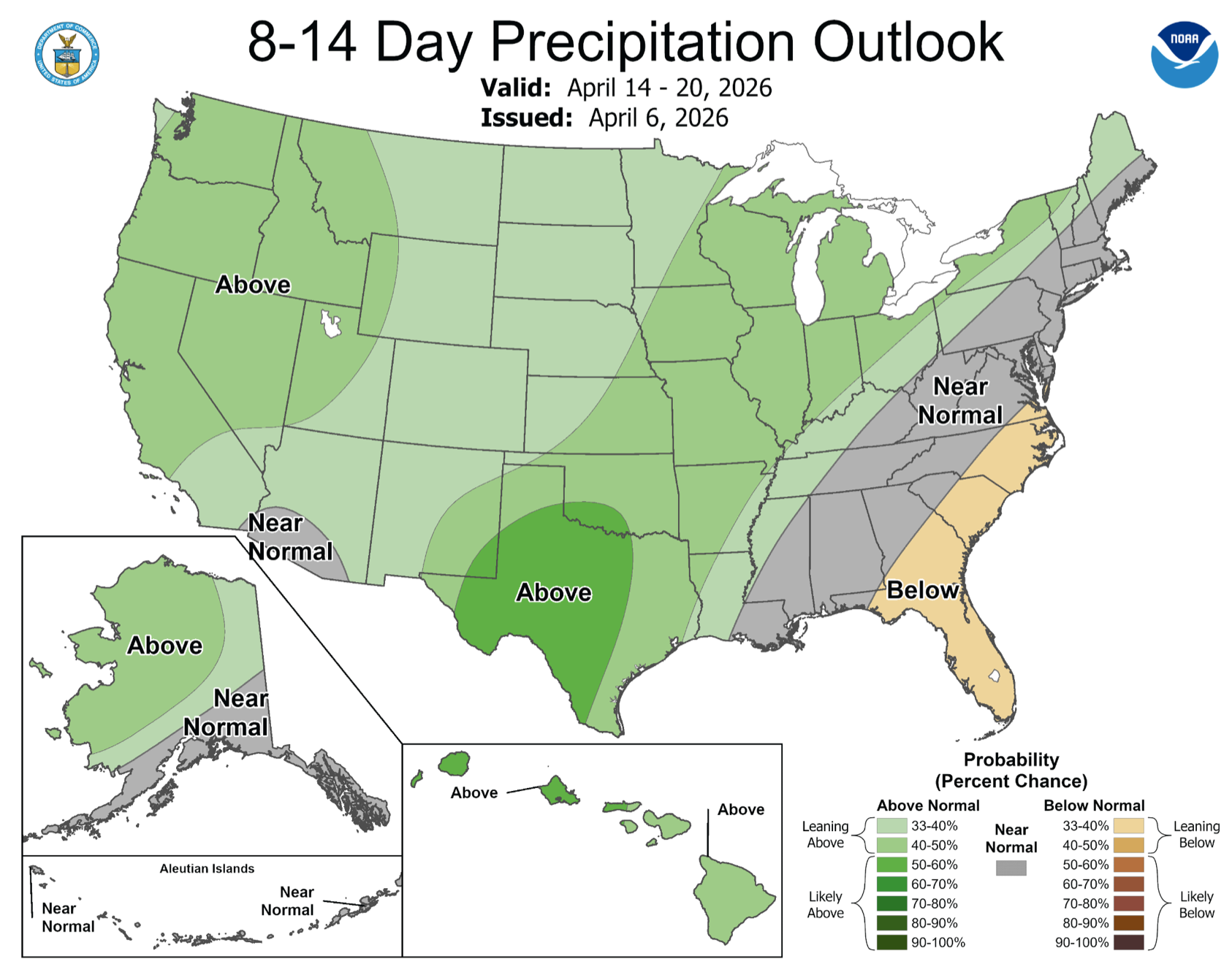 In terms of precipitation, the 6โ10-Day Outlook calls for above-normal precipitation across the Far West, northern Rockies, New Mexico, Texas, the South (eastern extent), portions of the central and southern Plains, Midwest, and Northeast. Near-normal precipitation is expected across the Intermountain West, Desert Southwest, areas of the South, Mid-Atlantic, and coastal New England. Below-normal precipitation is favored across the Southeast and portions of the Mid-Atlantic.