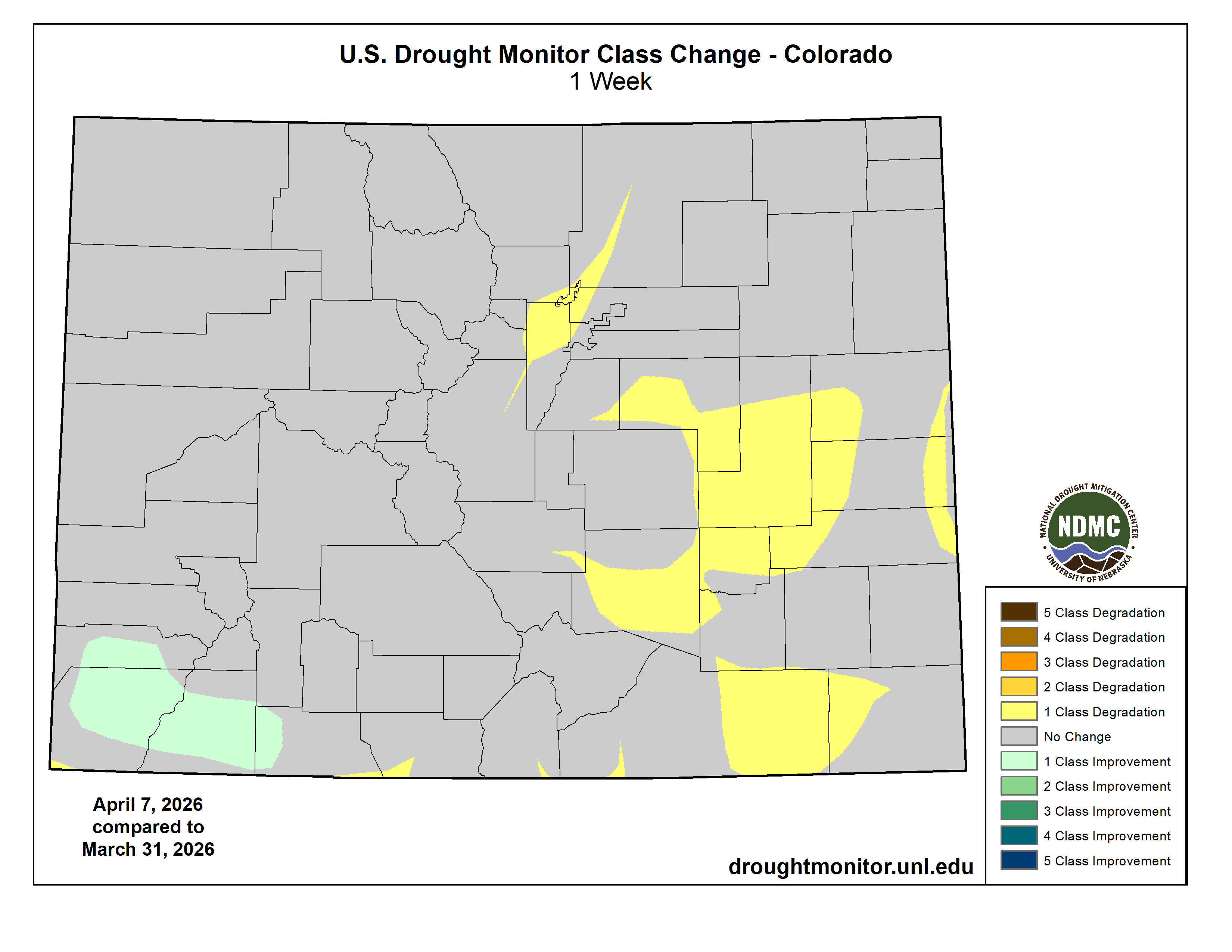 Colorado Drought Monitor one week change map ending April 7, 2026.