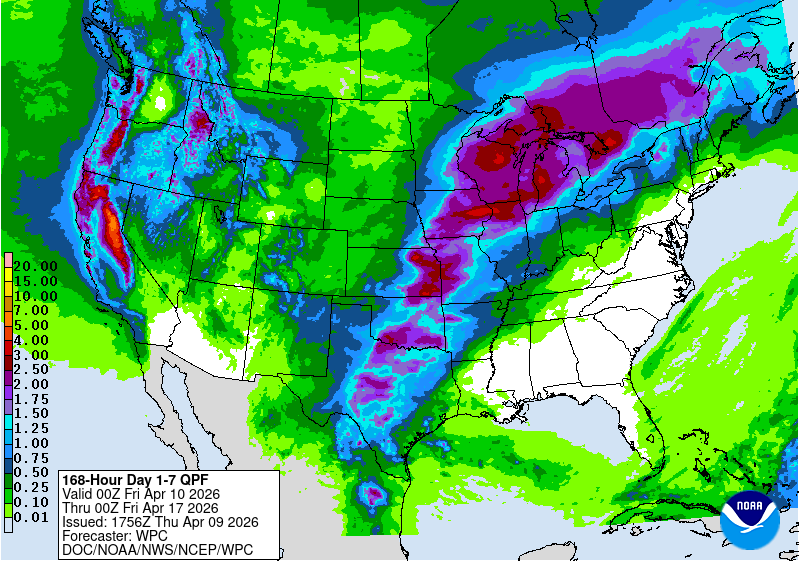The NWS Weather Prediction Center 7-Day Quantitative Precipitation Forecast calls for precipitation accumulations generally ranging from 1 to 4 inches across eastern portions of the Southern Plains, Midwest, and Northeast, with the heaviest totals (locally 3 to 4 inches) along a corridor extending from eastern Oklahoma and Arkansas through the Mid-Mississippi Valley into eastern portions of the Upper Midwest. Across the Southeast and Mid-Atlantic, very dry conditions are expected, with little or no precipitation across most areas. The highest totals in the region are expected in isolated areas of eastern Florida, where accumulations may reach 2 to 3 inches. Across the High Plains, light-to-moderate precipitation accumulations ranging from 0.25 to 1.5 inches are expected, with the greatest totals across the eastern extent of the region. In the West, moderate-to-heavy liquid precipitation accumulations are expected across areas of California, particularly along the central and northern Sierra Nevada and coastal ranges, as well as portions of the central and northern Rockies, with lighter to moderate totals across portions of the Pacific Northwest. Dry conditions are expected to prevail across much of the Southwest, including areas of the southeastern California deserts, southern Nevada, Arizona, and New Mexico.