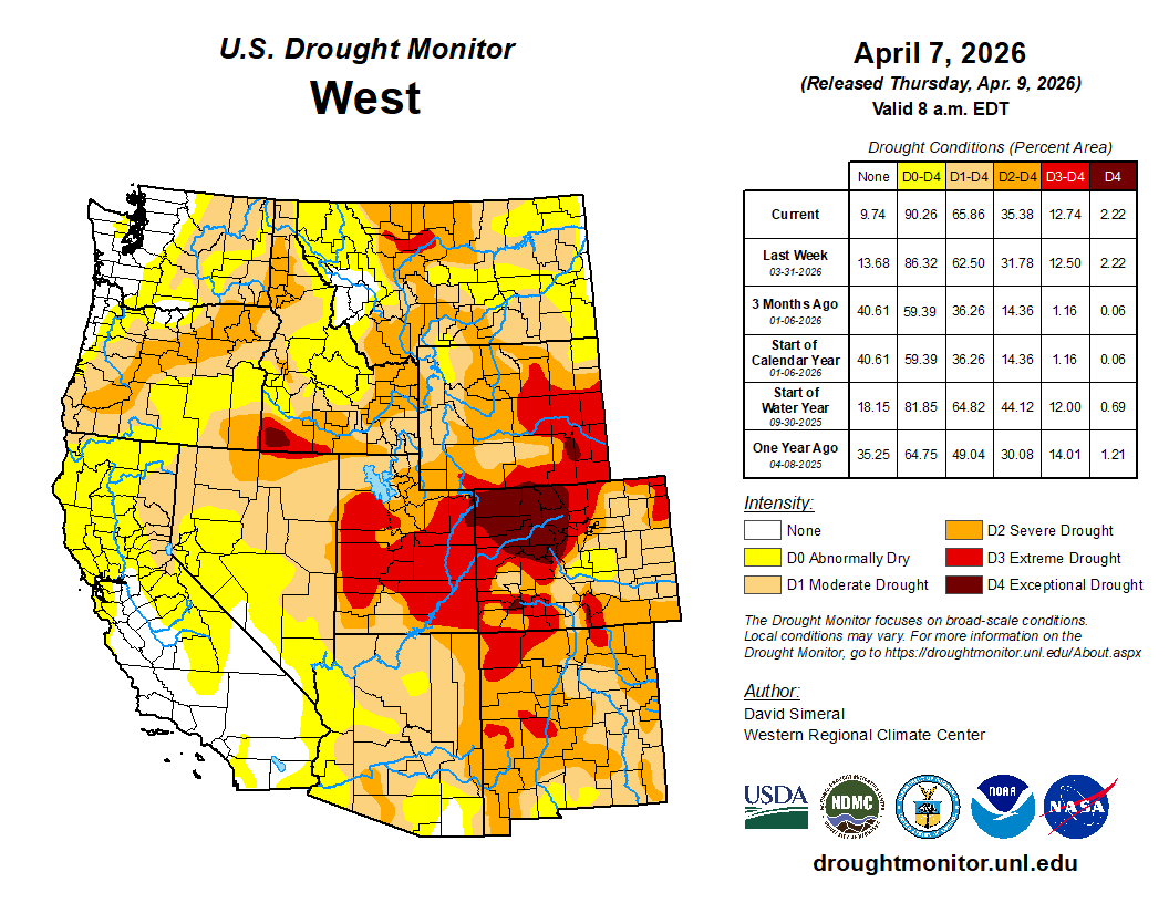 Conditions continued to deteriorate in the region with degradations made across southern Oregon, Northern California, southwestern Montana, northwestern Wyoming, and New Mexico. Despite some precipitation falling across the mountain ranges of the region this week, the snowpack conditions remain extremely poor with the remaining snowpack primarily restricted to the highest elevations. In Colorado, NRCS is reporting statewide SWE at the lowest on record. Historically, median peak SWE in Colorado occurs on April 8, however, this year peak SWE occurred on March 8. In Washington state, the Department of Ecology issued a statewide emergency drought declaration as projected water supplies are expected to be well below normal levels. In the Colorado River Basin, Lake Powell is 24% full, while Lake Mead is 33% full, according to the U.S. Bureau of Reclamation. Across areas of the Far West, very dry conditions were observed during the past 30-day period (March 7 to April 7), with record to near-record dryness at the following locations: Eugene, OR (10th driest; -2.57 inches); Medford, OR (9th driest; -1.38 inches); Crescent City, CA (2nd driest; -5.58 inches); Mount Shasta, CA (driest on record; -5.35 inches); San Francisco, CA (5th driest; -2.34 inches); Santa Cruz (driest on record; -3.13 inches); Monterey, CA (3rd driest; -2.8 inches), and San Diego, CA (driest on record; -1.24 inches)…