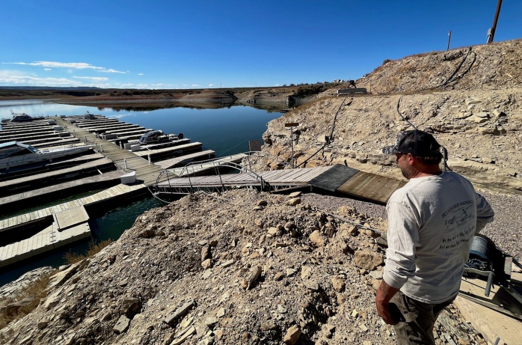 Buckboard Marina owner Tony Valdez, seen here Sept. 26, 2022, says he’s made continual adjustments to boat docks to keep up with lowering water levels at Flaming Gorge Reservoir. (Dustin Bleizeffer/WyoFile)