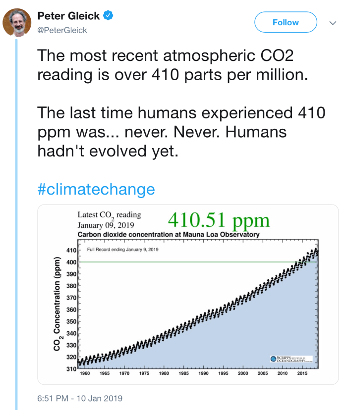 On Tuesday, the Mauna Loa Observatory recorded its first-ever carbon dioxide reading in excess of 410 parts per million (it was 410.28 ppm in case you want the full deal). Carbon dioxide hasn’t reached that height in millions of years. It’s a new atmosphere that humanity will have to contend with, one that’s trapping more heat and causing the climate to change at a quickening rate.