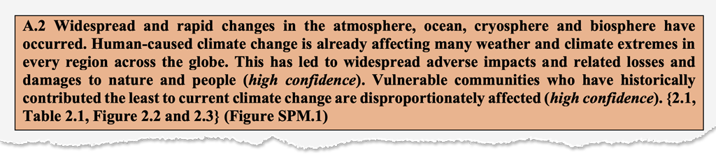 “Widespread and rapid changes in the atmosphere, ocean, cryosphere and biosphere have occurred. Human-caused climate change is already affecting many weather and climate extremes in every region across the globe. This has led to widespread adverse impacts and related losses and damages to nature and people.”
