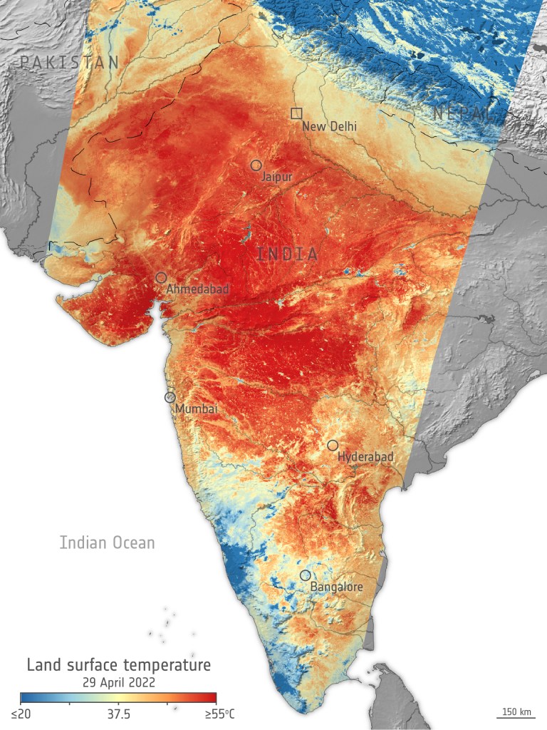 India in 2022 faced a prolonged heatwave, with temperatures exceeding 42°C in numerous cities across the country. This came just weeks after India recorded its hottest March since the country’s meteorological department began its records over 120 years ago. This image, produced using data from the Copernicus Sentinel-3 mission, shows the land surface temperature across most of the nation. According to the India Meteorological Department, maximum air temperatures reached 43-46°C over most parts of Rajasthan, Vidarbha, Madhya Pradesh and East Uttar Pradesh; in many parts over Gujarat, interior Odisha; and in some parts of Madhya Maharashtra on 28 April. Forecasters warned that heatwave conditions are expected to continue until 2 May. Experts at the Indian Institute of Technology’s Water and Climate Lab stated that, in recent years, the number of Indian states hit by heatwaves has increased, as extreme temperatures become more frequent. Owing to the absence of cloud cover on 29 April (10:30 local time), the Sentinel-3 mission was able to obtain an accurate measurement of the land surface temperature of the ground, which exceeded 60°C in several areas. The data shows that surface temperature in Jaipur and Ahmedabad reached 47°C, while the hottest temperatures recorded are southeast and southwest of Ahmedabad (visible in deep red) with maximum land surface temperatures of around 65°C. The map was generated by using the mission’s Sea and Land Surface Temperature Radiometer instrument. While weather forecasts use predicted air temperatures, this satellite instrument measures the real amount of energy radiating from Earth. Therefore, the map shows the actual temperature of the land’s surface pictured here, which is usually significantly hotter than air temperatures. Sentinel-3 can monitor wildfires, map the way the land is used, provide indices of vegetation state, as well as measure the temperature, colour and height of the sea surface. For more information on the Copernicus Sentinel-3 mission, click here. By Contains modified Copernicus Sentinel data 2022, Attribution, https://commons.wikimedia.org/w/index.php?curid=117497147