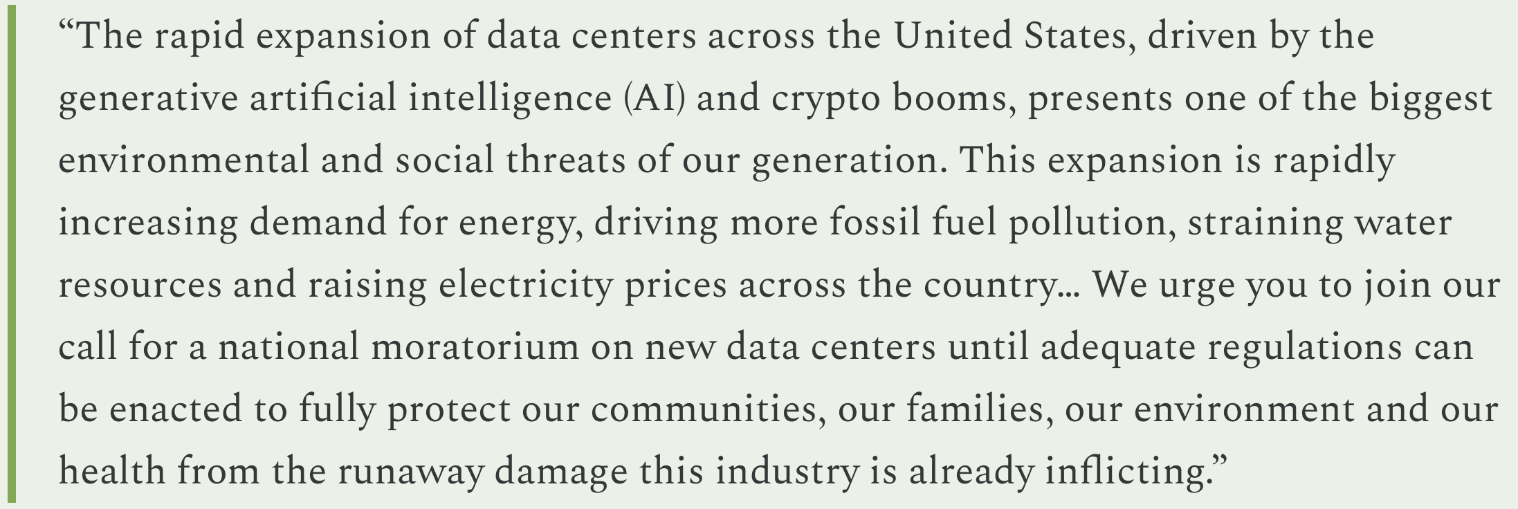 This week, a group of more than 200 environmental, social justice, and consumer organizations sent a letter to Congress calling for a nationwide ban on new data centers. It says, in part: