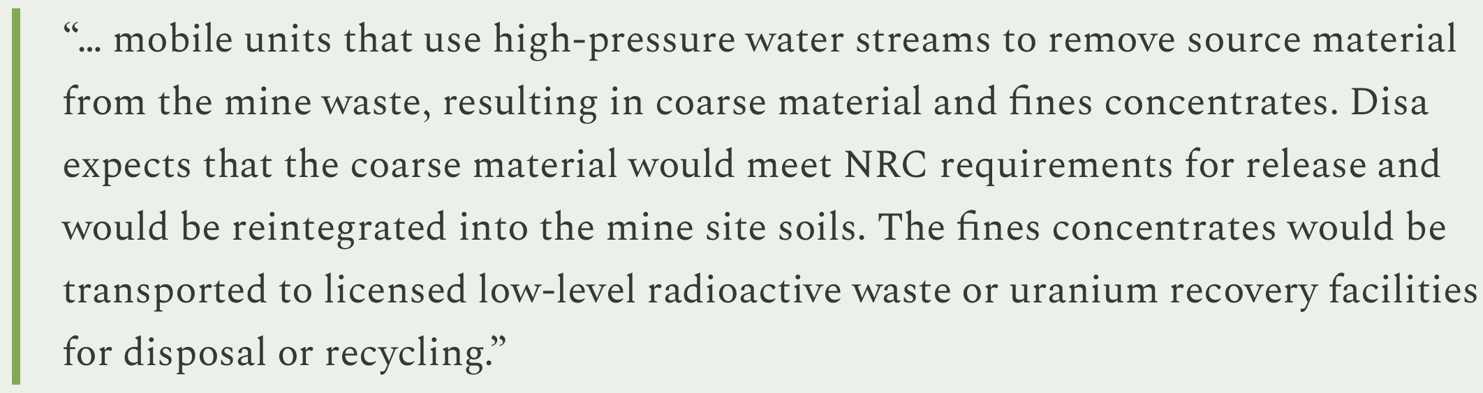 Because the process is separating uranium and thorium fines from ore, it is considered a form of milling, not mining. And thatโs an important distinction, because when you mill uranium ore, you leave behind mill tailings, which must be disposed of according to NRC and Environmental Protection Agency standards. Instead, the โcoarse material,โ as the waste is described, would be reintegrated into the mine site โ even though it may contain radioactive and other harmful materials.
