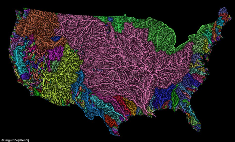 Created by Imgur user Fejetlenfej , a geographer and GIS analyst with a ‘lifelong passion for beautiful maps,’ it highlights the massive expanse of river basins across the country – in particular, those which feed the Mississippi River, in pink.