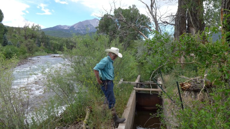 Crystal River rancher Bill Fales stands at the headgate for the Helms Ditch, with Mount Sopris in the background. As part of an agreement with the Colorado Water Trust, Fales could be paid to reduce his diversions from the ditch when the river is low. CREDIT: HEATHER SACKETT/ASPEN JOURNALISM