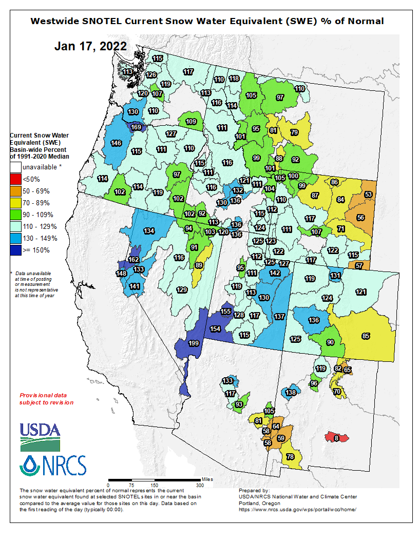 Westwide SNOTEL basin-filled map January 17, 2022 via the NRCS.