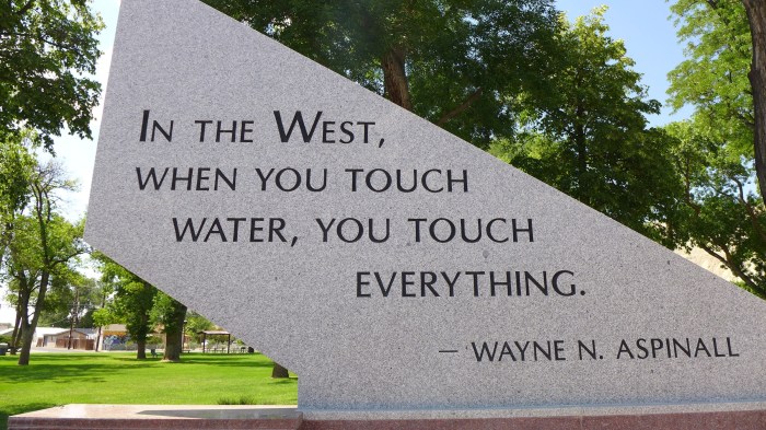 Aspinall’s quote, “In the West, when you touch water, you touch everything,” is carved into stone in a park near the Colorado River in Palisade, but Tipton expressed it as “When you touch water in the West, it is really the lifeblood of what we are and who we are in our state.”