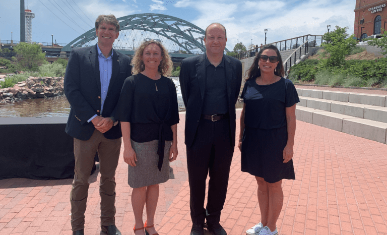 Colorado Gov. Jared Polis signed HB21-1238 into law in a ceremony at the Denver Botanic Gardens in June 2021. From left, State Sen. Chris Hansen, CRES member Laurent Meillon, State Rep. Tracey Bernett, Gov. Jared Polis, Becky Long, and Howard Geller of the Southwest Energy Efficiency Project. Photo credit: Big Pivots