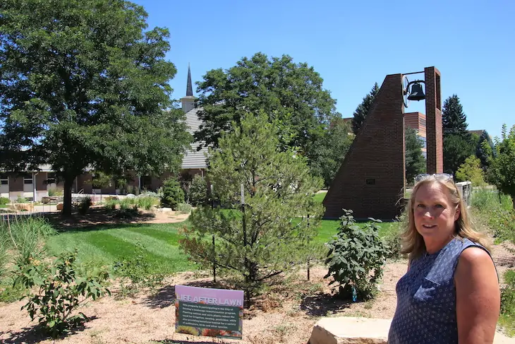 Every turf conversion project needs a champion, says Ruth Quade, water conservation administrator for Greeley. This lawn of this Presbyterian church has been partially replaced with pollinator-friendly vegetation. Photo/Allen Best