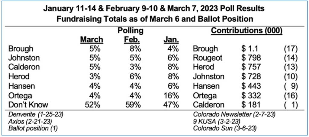 Brough and Johnston are the two strongest establishment candidates, according to polling and contributions, including dark money. Johnston just received the Denver Post endorsement, which should provide a boost. Advertising quality and quantity will be important since the candidates don’t appear to have generated much grassroots passion. Total contributions: $1.7 million Brough to $1.6 million Johnston. The table shows contributions matched by the Fair Election Fund.