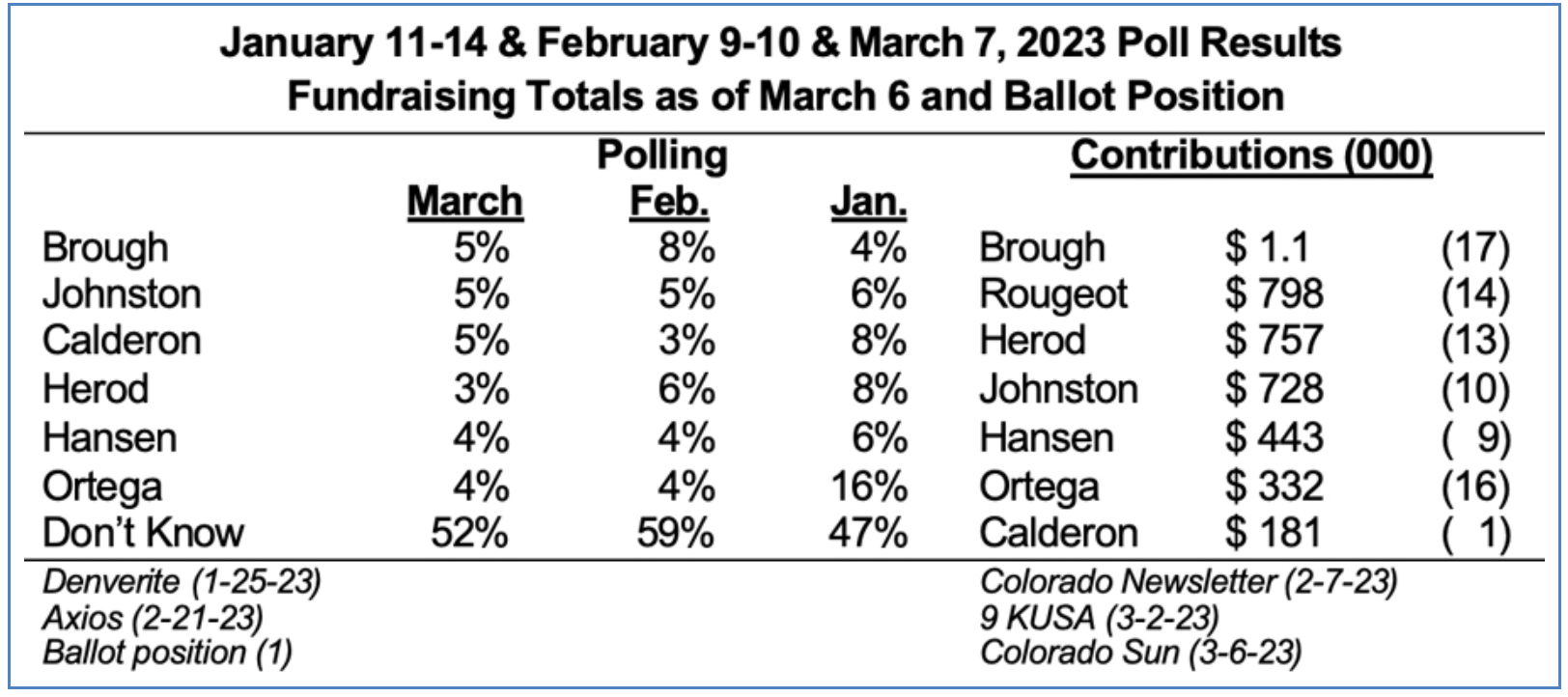 I just spent last week in conversation with a dozen leaders in business, media (retired), campaign consulting (none working the Denver Mayors race), former Denver officeholders, and other sectors (water, culture, nonprofits). Also, I assembled the latest polling and public campaign finance contributions.
