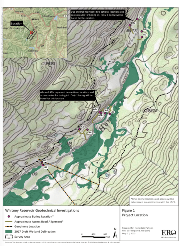 This map shows the location of test holes Homestake Partners plans to drill as part of its geotechnical investigation into the feasibility of a dam site in the Homestake Creek valley. The Forest Service has received more than 500 comments, most of them in opposition to, the drilling and the overall reservoir project. Credit: USFS via Aspen Journalism