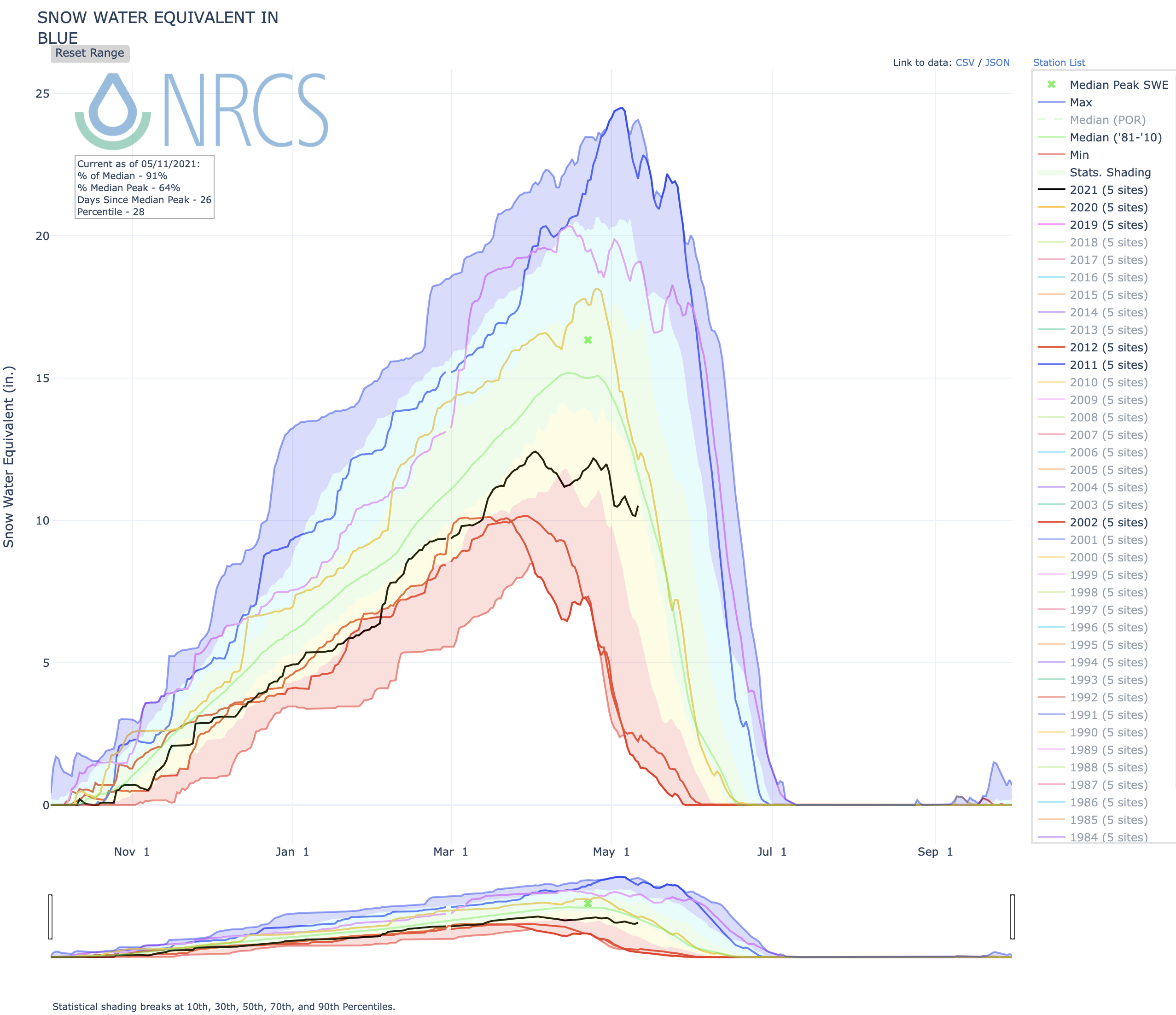 The snowpack has declined in May and is currently sitting at 9.8 inches of snow-water equivalent on Copper Mountain, or 82% of the 30-year median. The upper Colorado River basin, which Summit County falls into, is at 65% of normal snow-water equivalent as of May 10.