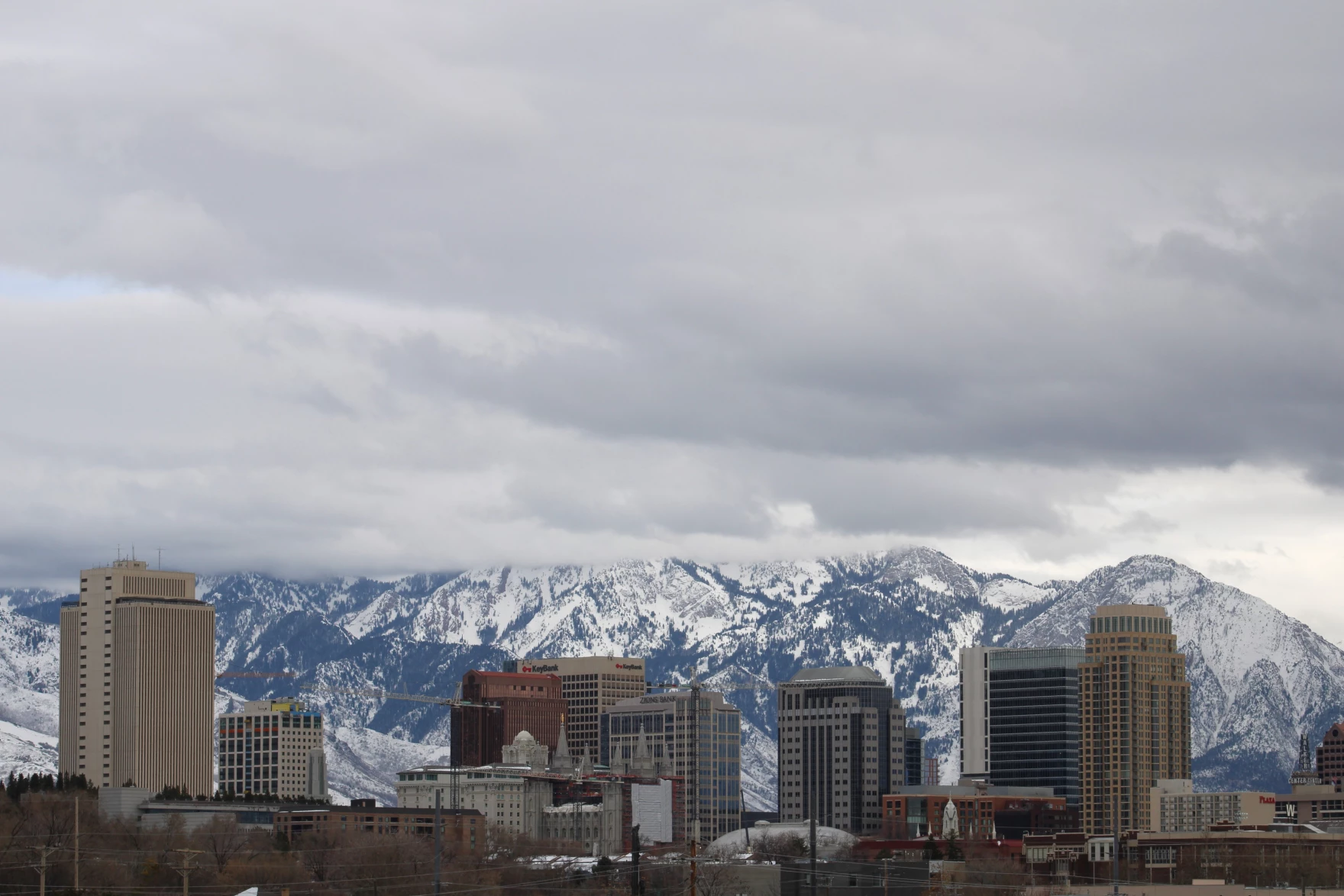 Clouds hang low behind Salt Lake City’s skyline on March 20, 2025. Boosting snow is pivotal for Utah’s water supply, 90% of which starts as snow in the state’s mountains.