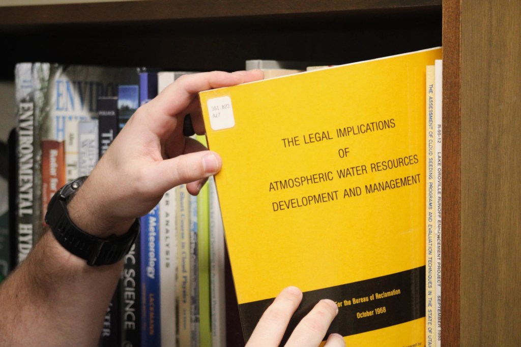 Jonathan Jennings browses his collection of decades-old books about cloud seeding in his Salt Lake City office on March 20, 2025. The technology has looked largely the same since the 1950s. Alex Hager/KUNC
