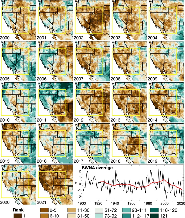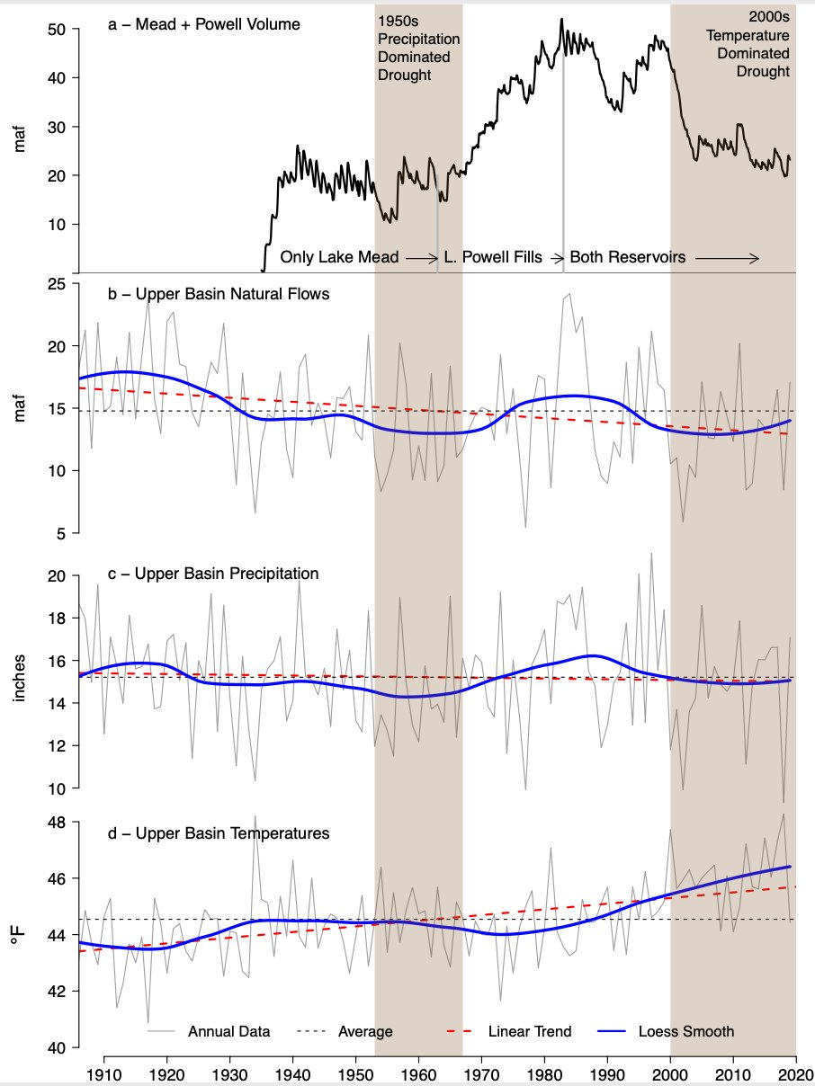 Udall/Overpeck 4-panel Figure Colorado River temperature/precipitation/natural flows with trend. Lake Mead and Lake Powell storage. Updated through Water Year 2024. Credit: Brad Udall