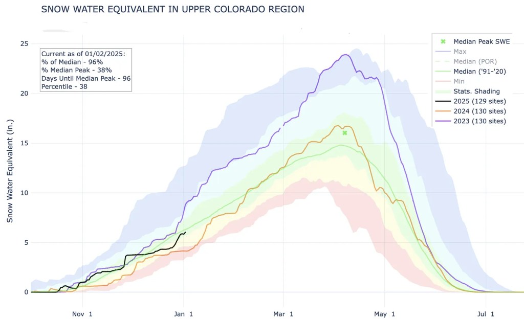 Snowpack levels in the watersheds that feed Lake Powell are just about normal for this time of year, thanks to some late-December storms across the region. But as you can see from 2023 (the purple line), there’s plenty of time left for it to be a huge snow year — or a downright crappy one if the precipitation suddenly stops. Source: NRCS.