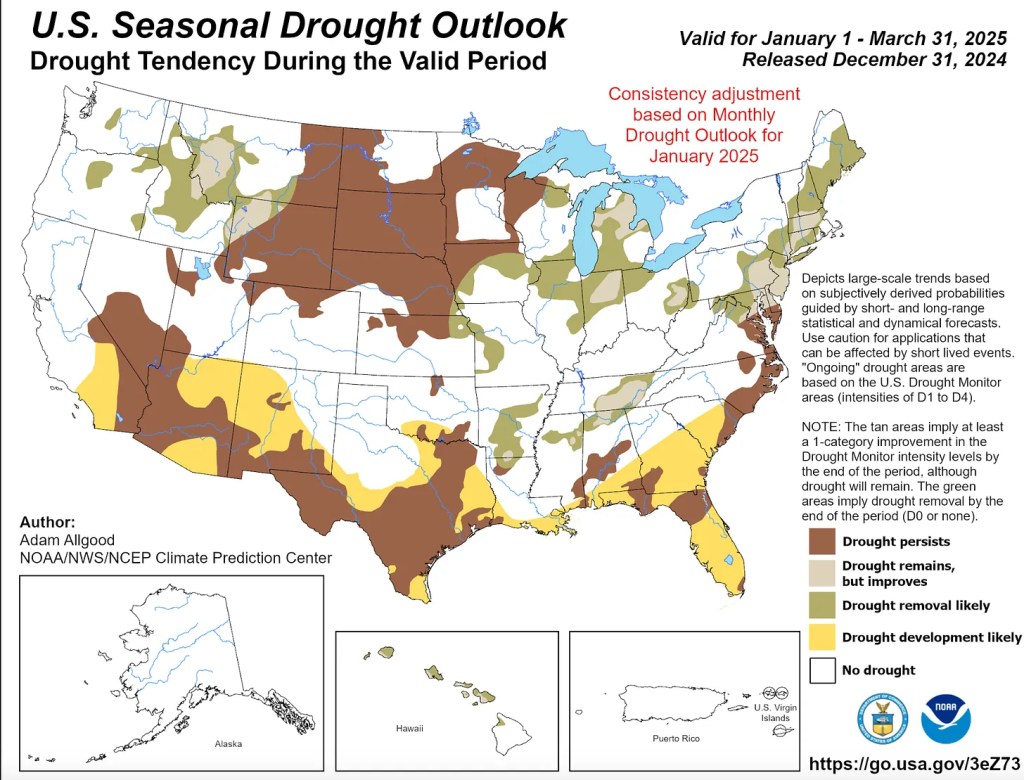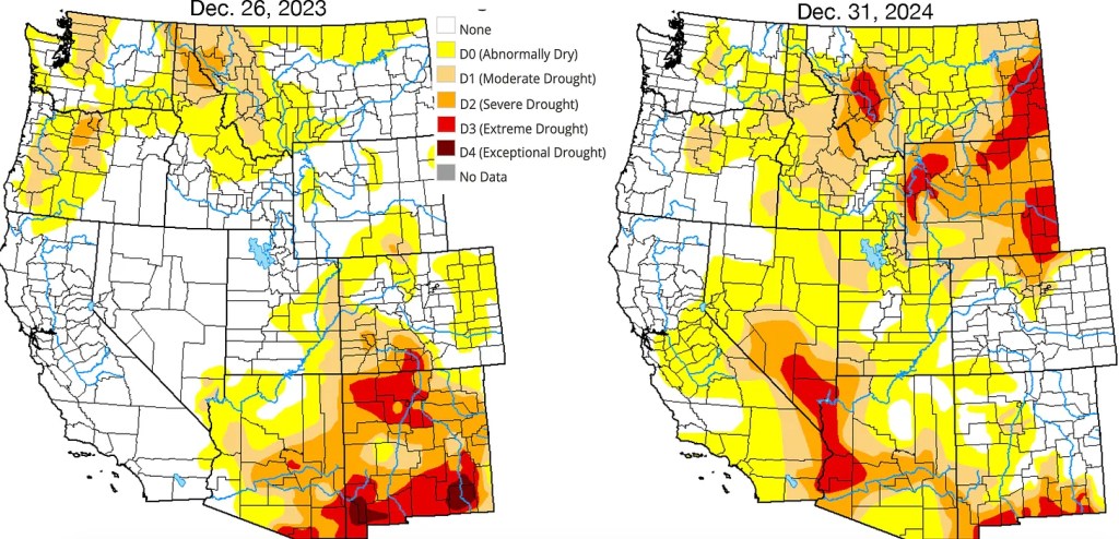 Things were looking pretty grim in western Wyoming’s Upper Green River watershed until December snows pushed the snowpack almost up to normal for this time of year. The entire state was quite dry last year and it’s looking like the drought will persist there.