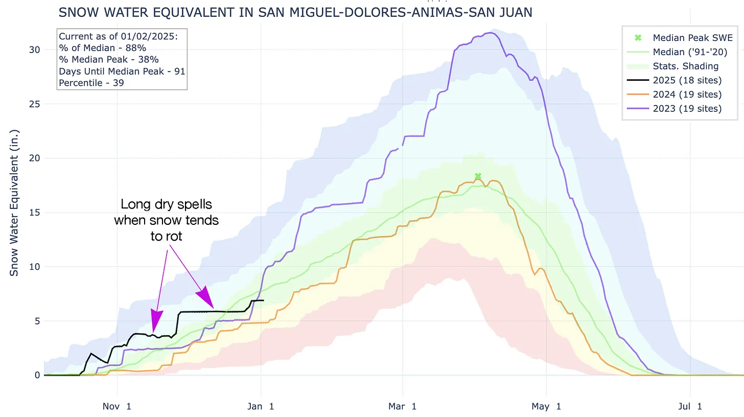 Southwestern Colorado got some good dumps in October and November, pushing the snowpack far above average and into the 90th percentile. But a dry December brought snowpack levels down below “normal” for the 1991-2020 period. Still, this year’s levels almost mirror 2023’s, when snow season didn’t get going until January. Source: NRCS.