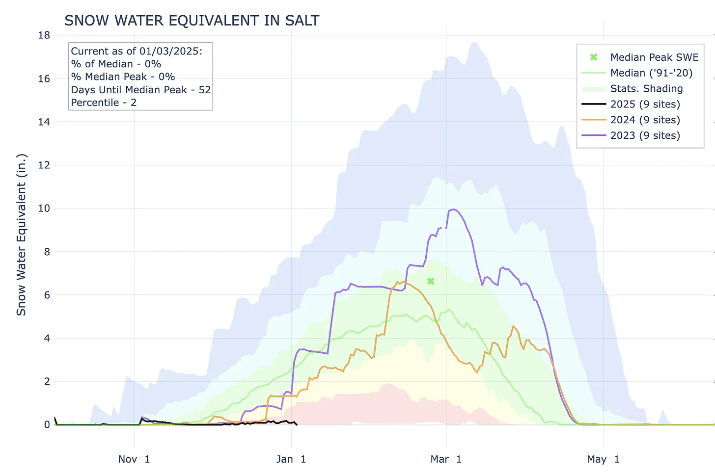 The Salt River watershed in central Arizona has received hardly any snow so far this year and continues to lag far behind the 2023 and 2024 water years. The lack of moisture and unusually high temperatures in December don’t bode well for the region’s runoff. Source: NRCS.