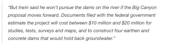 Finally, an additional twist, as reported in a recent Associated Press article, the developer concedes that there was overwhelming opposition to his original proposal, and that he would consider pulling the proposals in the Little Colorado River if this Big Canyon proposal were allowed to move forward. From the article: