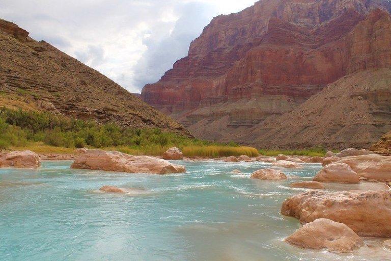 The Little Colorado River gets its blue color from dissolved calcium carbonate in the water. This mineral is found in chalk, antacids, eggshells, dark green vegetables, rocks, and more. In the Little Colorado River, calcium carbonate forms a type of limestone called travertine that creates white, pillowy deposits along the riverbed. Most of the turquoise-blue water in the Little Colorado River comes from springs 10 to 13 miles upstream of the confluence. Thanks to these groundwater-fed springs, the last 13 miles of the Little Colorado River flow year-round at an average rate of 220 cubic feet per second (cfs) until joining the mighty Colorado River, which has an average flow between 8,000 and 25,000 cfs!