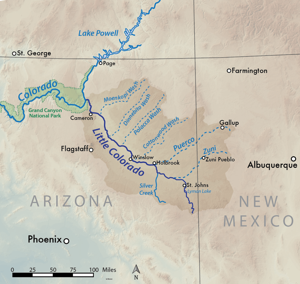 The Little Colorado River (LCR) is essentially a misnomer—“little” only in title and by comparison to the Colorado River. The LCR basin is 27,000 square miles of high deserts, mesas, and mountains near the center of the Colorado Plateau. Its grandeur can be understood from various angles. As part of the larger Colorado Plateau, the LCR basin has the highest agricultural and ethnolinguistic diversity north of the Tropic of Cancer. The river itself originates in the White Mountains where its headwater springs have been designated as a sacred site by the White Mountain Apache Tribe. From there, the river drops over 5,000 feet as it flows northwest to its Confluence with the Colorado River deep within Grand Canyon. As it nears the mainstem Colorado, the LCR cuts steeply into limestone and sandstone, creating the spectacular lower LCR gorge. Springs in the lower gorge provide the cerulean baseflow of the LCR, which at the Confluence with the Colorado is approximately 158,000 acre feet annually—equivalent to over half of Nevada’s allocation of Colorado River water.