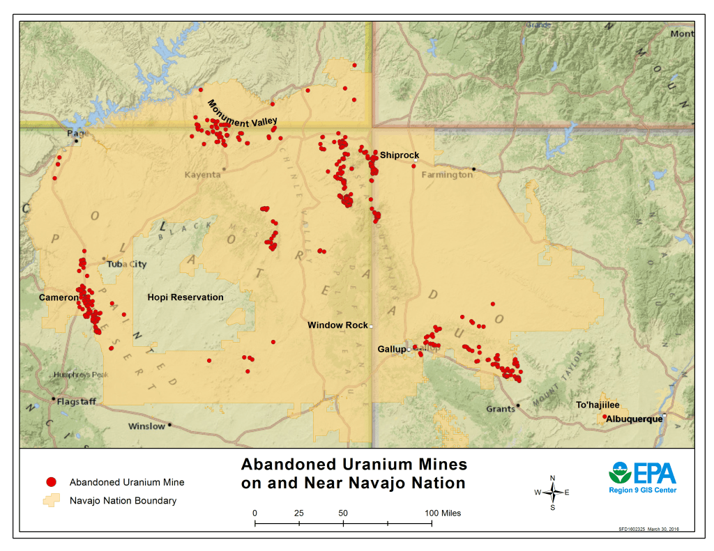 Commercial exploration, development, and mining of uranium at Quivira Mines began in the late 1960s by the Kerr-McGee Corporation and later its subsidiary. The mine sites are the former Church Rock 1 (CR-1) mining area; the former Church Rock 1 East (CR-1E) mining area; and the Kerr-McGee Ponds area. The mines were in operation from 1974 to the mid-1980s and had produced about 1.2 million tons of ore, making them among the 10 highest producing mines on the Navajo Nation…From World War II until 1971, the U.S. government was the sole purchaser of uranium ore, driving extensive mining operations primarily in the southwestern United States. These efforts employed many Native Americans and others in mines and mills. Between 1944 and 1986, nearly 30 million tons of uranium ore were extracted from Navajo lands under leases with the Navajo Nation. With over 500 abandoned uranium mines — many say the total could be in the thousands — clean up of mines has always been a battle.