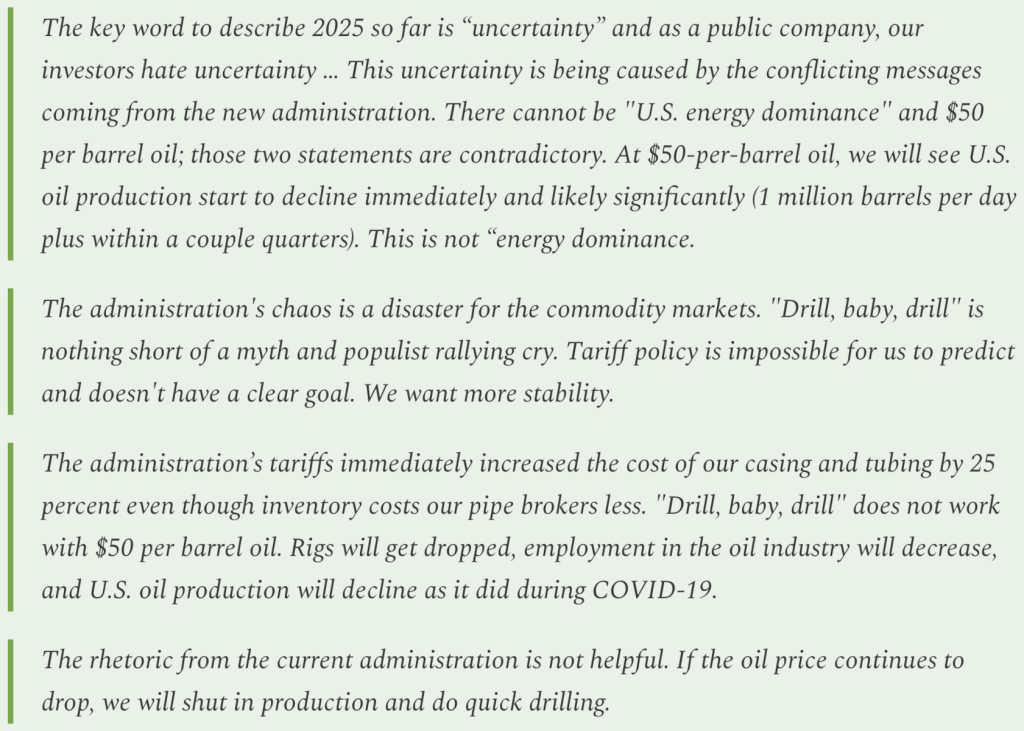 See, the thing about tariffs is that they very well may raise the price you pay for gasoline (depending on where your local refinery gets its crude oil), but the economy-dampening part of tariffs actually brings down the price of oil, while also raising the cost of steel pipes and other supplies. That’s no bueno for petroleum companies, whose profit margins are directly proportional to the price of crude.