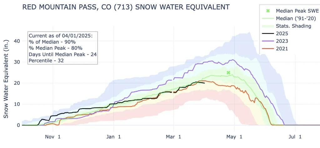 And there’s big variations over short distances. Red Mountain Pass is still just below median, for example, while the southern San Juan Mountains, just a few dozen miles away, are experiencing a severely dry winter.