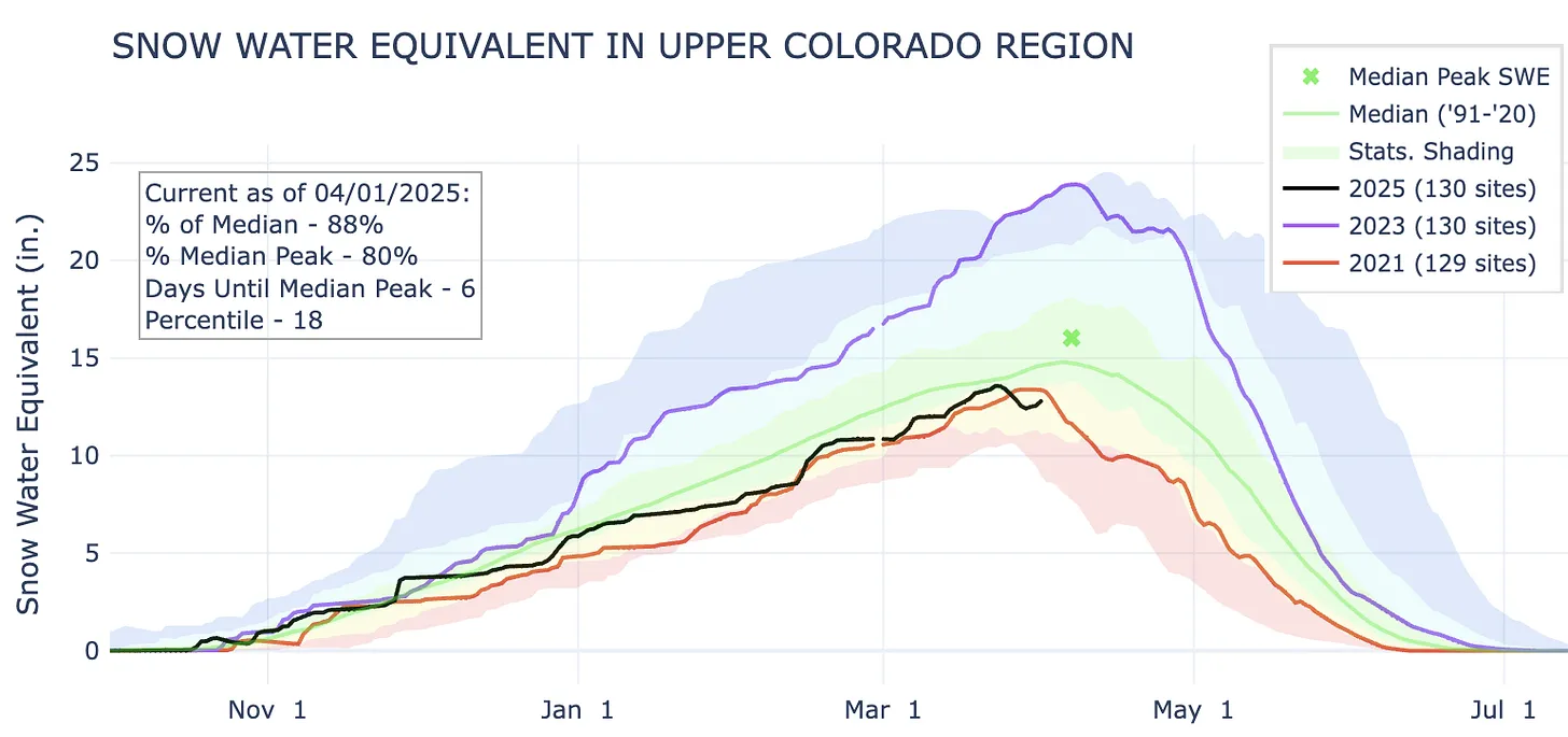 The watersheds that feed Lake Powell are not in terrible shape, sitting at 88% of the median just six days before the typical peak. However, levels are lower than they were in 2021 at this time, and 2021 was not a good year for the Colorado River. Source: NRCS.