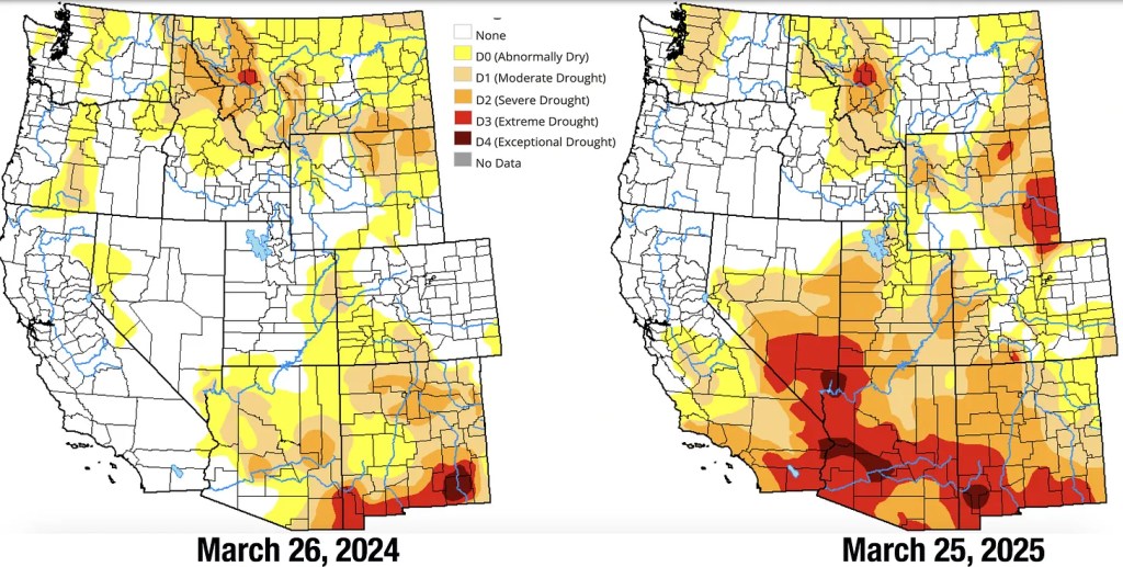 Before I get to the graphics, however, a quick note. The snowpack and precipitation plots I run here come from the USDA’s Natural Resources Conservation Service. It’s just one of the valuable services they provide. I haven’t found any stats on whether DOGE has gone after NRCS’s staff, yet. But the DOGE website says it has or will cancel the leases for the following NRCS offices. Whether they and their staffs will simply go away, be absorbed into another facility, or what, isn’t disclosed.