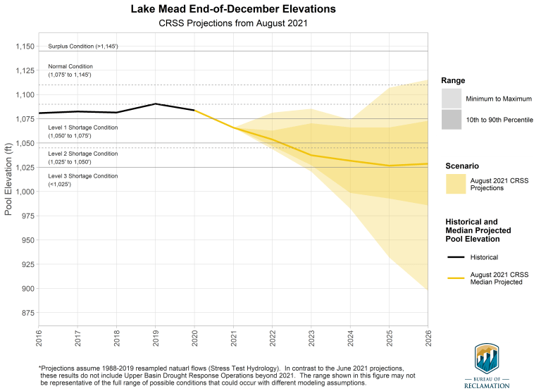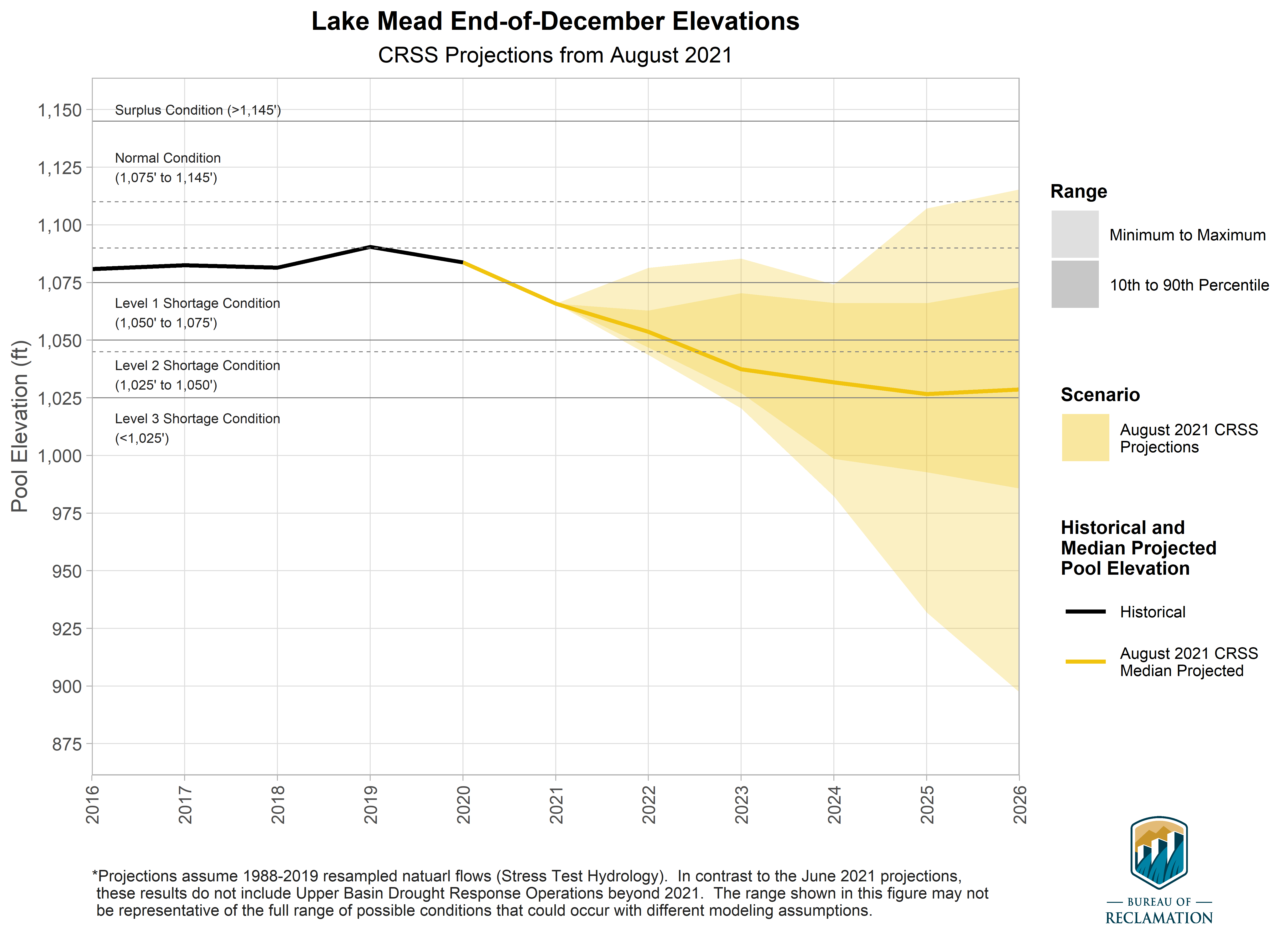 Projection of Lake Mead end-of-December reservoir elevations. The colored region, or cloud, for the hydrology scenario represents the minimum, 10th percentile, 90th percentile, and maximum of the projected reservoir elevations. Solid lines represent historical elevations (black), and median projected elevations for the scenario (yellow). Dashed gray lines represent important elevations for operations, and the vertical line marks the adoption of the 2019 Drought Contingency Plans. Graphic credit: Bureau of Reclamation